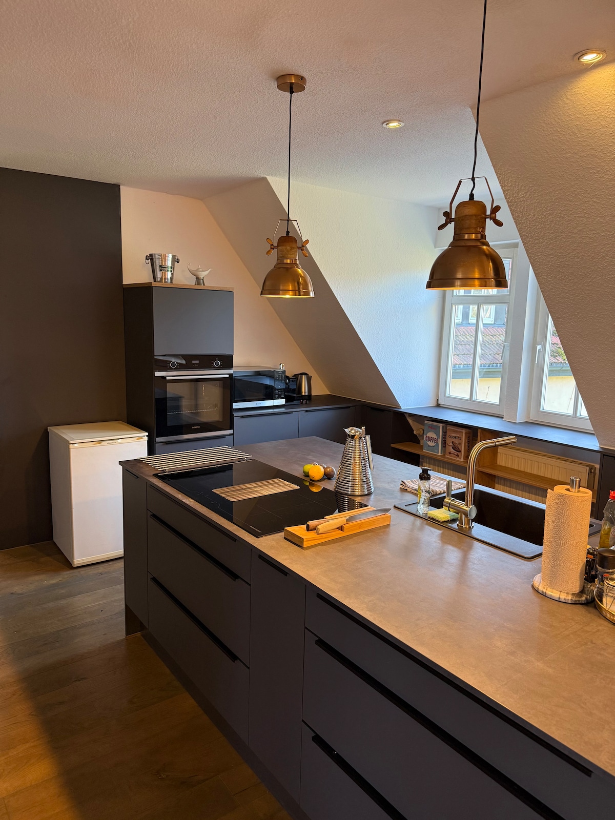 Tangkilikin ang espasyo para sa hanggang 4 na tao sa itaas na palapag na humigit - kumulang 70 m²: dalawang silid - tulugan na may komportableng double bed, kahanga - hangang taas ng kisame na 5.20 m at glazed front na may mga malalawak na tanawin ng Fulda, Frauenberg at Rhön. Ang kusina na kumpleto sa kagamitan, komportableng sala na may 65"smart TV at mararangyang banyo na may rain shower ay nagsisiguro ng kaginhawaan. Magrelaks sa takip na balkonahe o sa bahay sauna. May photovoltaics, parking space at e - bike charging station.