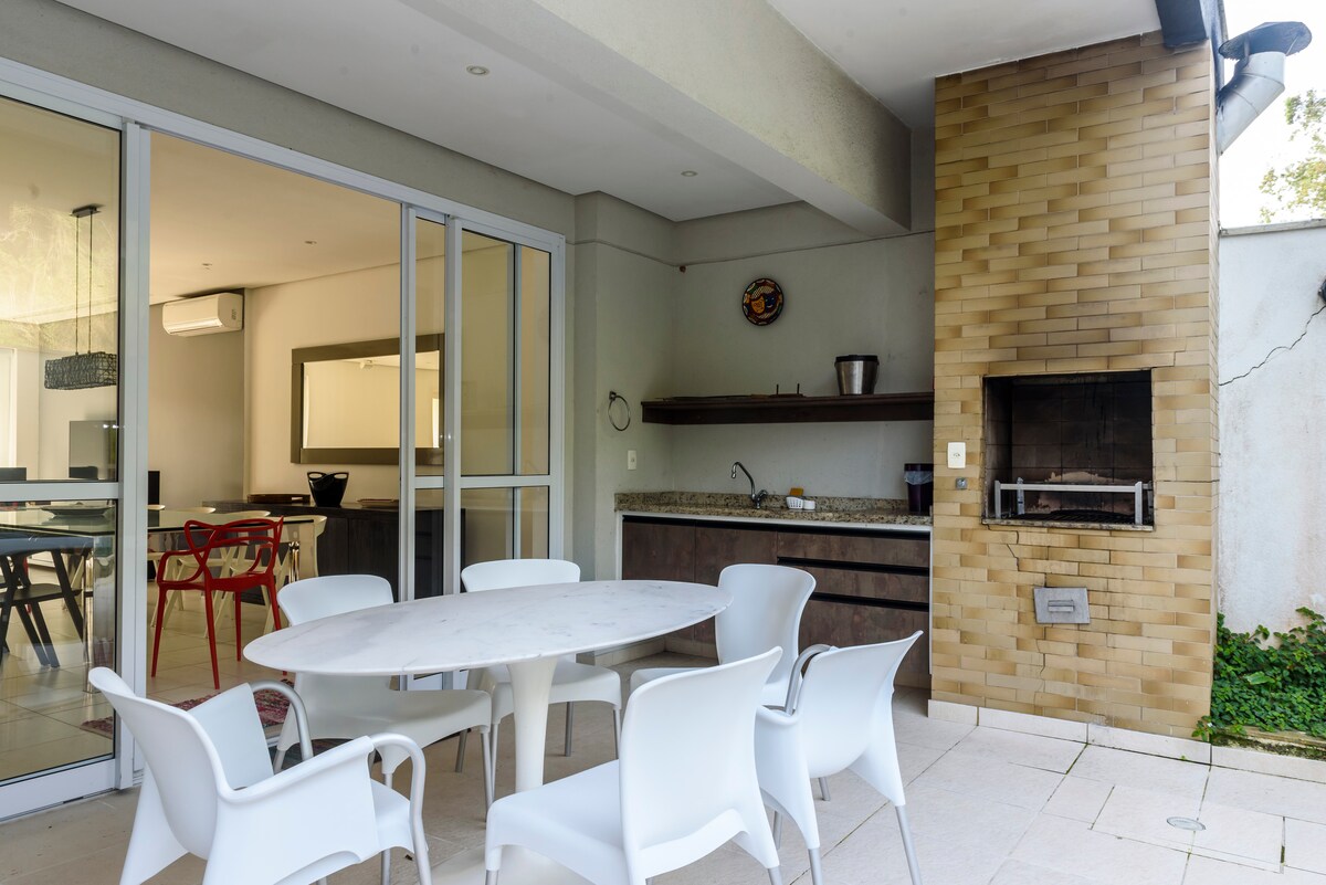 Maluwag at kaakit - akit na beach house, komportable at mahusay na pinananatili. Tamang - tama para sa mga pamilyang may mga bata. Maa - access para sa mga wheelchair. Tahimik at maaliwalas na berdeng setting sa hardin na may mga kakaibang prutas. Malaking pool na nakakuha ng araw buong araw. Paghiwalayin ang lugar ng BBQ. Madaling 6 na minutong lakad papunta sa mga beach ng Riviera at Itaguaré. Ang matatag at makapangyarihang (350Mb) na wifi ay gumagawa ng tanggapan sa bahay na isang mabubuhay na opsyon. Kumpleto sa gamit na kusina na may dishwasher. Air conditioning sa lahat ng 4 na silid - tulugan. Malalaking higaan. **May mga sapin + tuwalya.**
