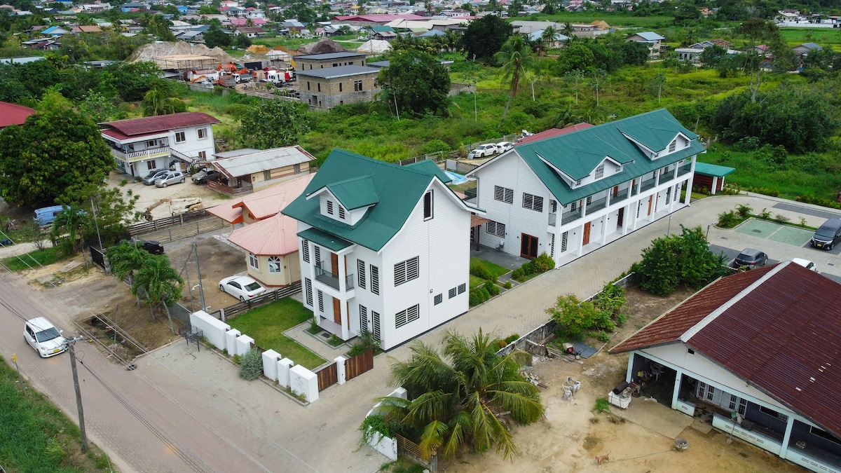 Matatagpuan ang apartment sa kanayunan sa pagitan ng Paramaribo at Lelydorp. Available para sa panandaliang pamamalagi para sa mga pensionado, expat, o mga taong nag - iisip lang na bumalik sa Suriname. Sa 3000 m2 ng pribadong lupain ay may sapat na paggalaw na posible at pribado pa, kung gusto mong mag - retreat. Ground floor: Nilagyan ng 3 silid - tulugan na apartment, lahat ng pasilidad (mainit/malamig na tubig, air conditioning, shower at toilet, kusina na may mga kasangkapan, Wifi, TV)