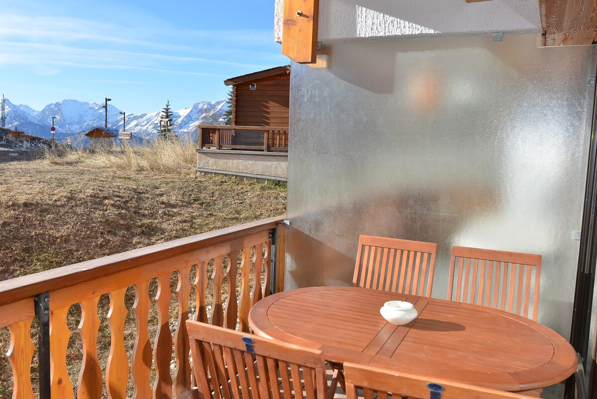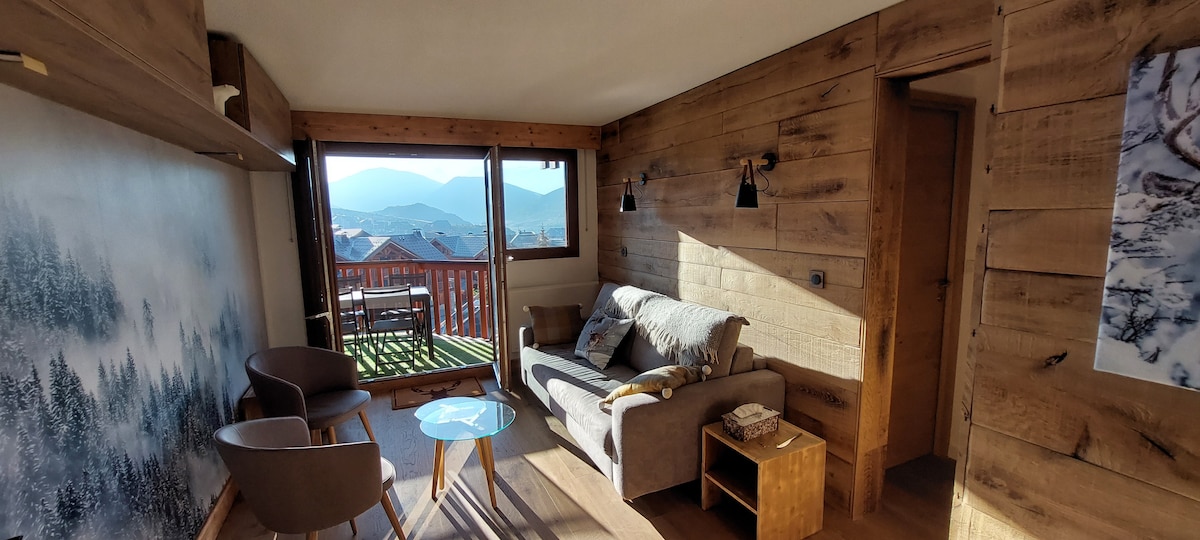 Magandang apartment 4 na kama, na may silid - tulugan, timog na nakaharap sa balkonahe na napakaliwanag, nakamamanghang tanawin ng lambak. Kamakailang naayos, gumagana, kumpleto sa kagamitan, malapit sa lahat ng amenidad (mga tindahan, restawran, nagpapaupa ng ski, package) TV, multilingual board game Mga daanan ng ski at bisikleta sa loob ng 2 minutong lakad (may locker) Posible ang diskuwento sa ski gear Libreng paradahan sa harap ng tirahan Halika at tamasahin ang mga lugar na ito bilang mag - asawa, magkakaibigan, o pamilya!