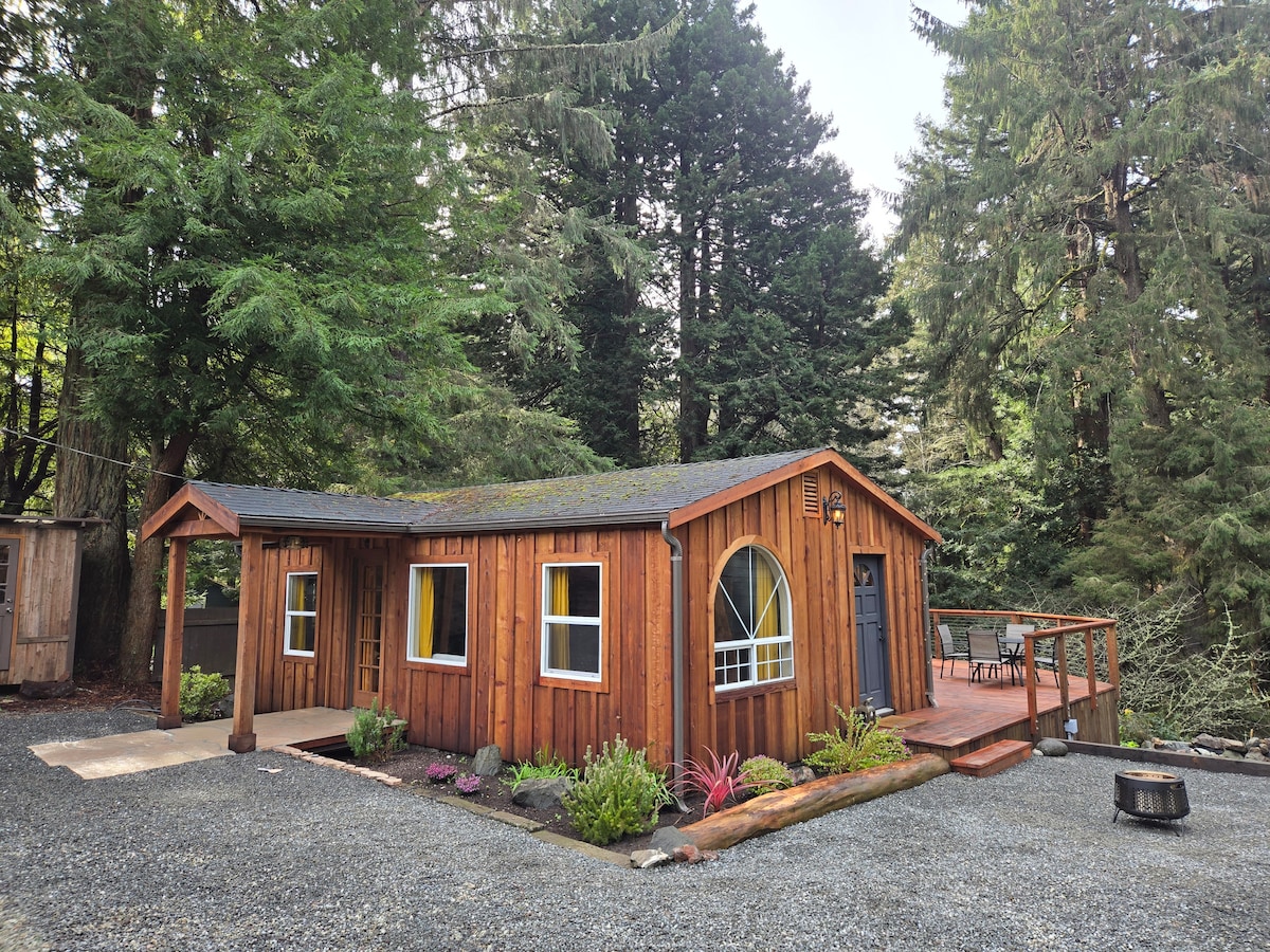 Isang payapang bakasyunan ang munting cabin na ito kung saan puwedeng mag‑relax at magpahinga. Regular na dumadalaw ang mga usang‑hayop at iba pang hayop. Matatagpuan ang hot tub sa isang maganda at pribadong parang na napapalibutan ng kagubatan ng redwood. Maginhawang matatagpuan ang lokasyon 15 minuto mula sa Arcata o Eureka. Mag-hike sa mga redwood, mamili sa Victorian Old Town, at kumain ng mga lokal na pagkaing pampanahon tulad ng salmon at alimango. Bumili ng mga pangangailangan sa Three‑Corners Market na tinatayang 5 minutong biyahe.