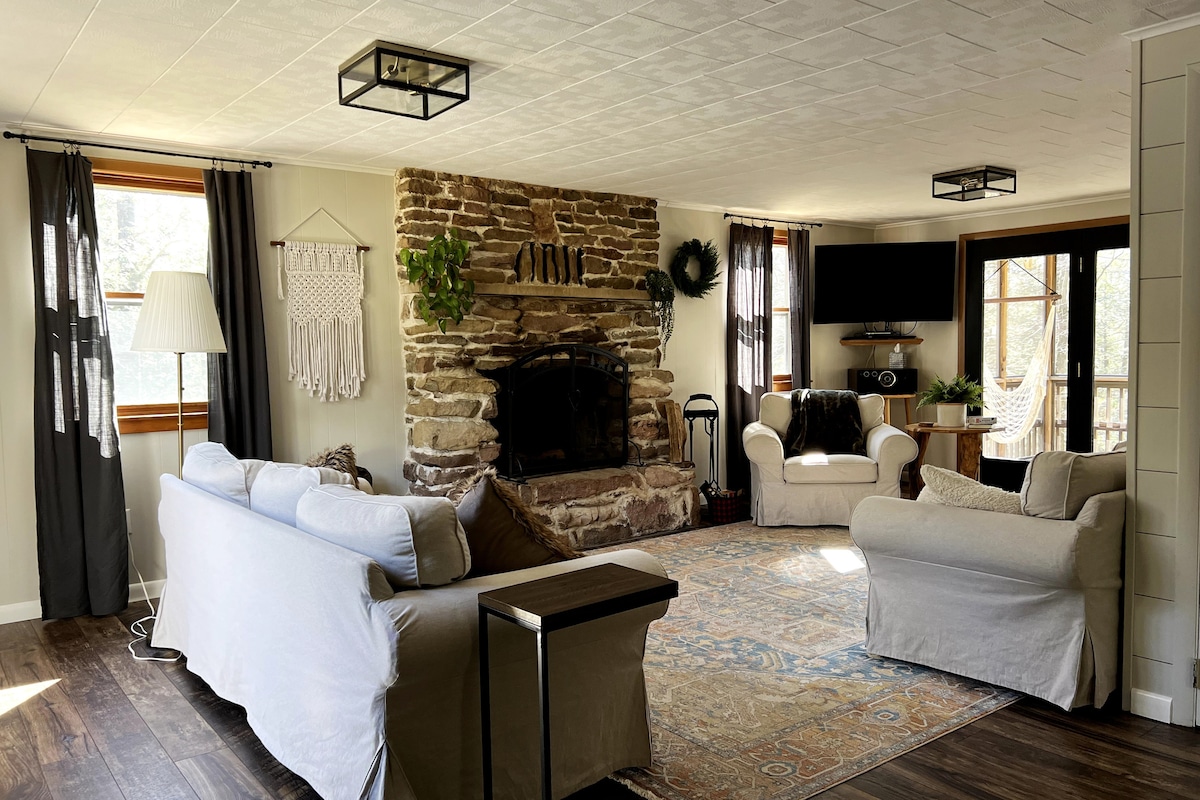 Kung naghahanap ka ng natatanging pasyalan mula sa pang - araw - araw na paggiling, tingnan ang aming makasaysayang cabin sa isang kaakit - akit na setting! Matatagpuan sa loob ng 30 minuto mula sa downtown State College, ang cabin ay may makasaysayang kagandahan, modernong amenities, at maraming pribadong outdoor space para makapagpahinga. May tatlong silid - tulugan, dalawang kumpletong paliguan, kusinang kumpleto sa kagamitan, maraming sala at panlabas na kainan, maraming espasyo ang cabin para sa lahat. Walang mahigpit NA panuntunan SA PANINIGARILYO.