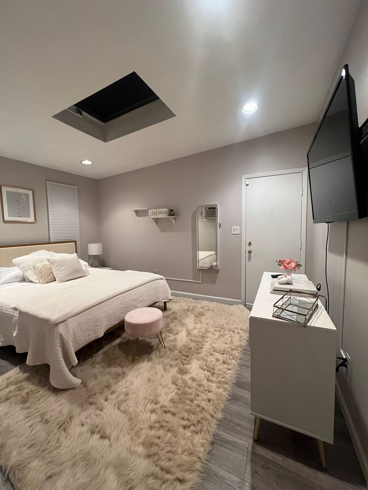 Mini-Barn Room # 3 Small room 1–2 guests only Send guest names to host Shed converted to 1-bed house KING bed 2 windows closet,hangers,desk,mirror,smartTV,WiFi,2 towels 3 rooms share 1 bath/1 kitchen outside barn Strict Rule:10 Minutes Bathroom Use Street parking No Pets No Visitors No Wheelchair No Washer/Dryer Bring own bodywash/shampoo/conditioner $1000 penalty if smoke/vape/drugs are detected in the room Airbnb Strict/Firm Cancellation Policy You agree to FULL DISCLOSURE below if you book