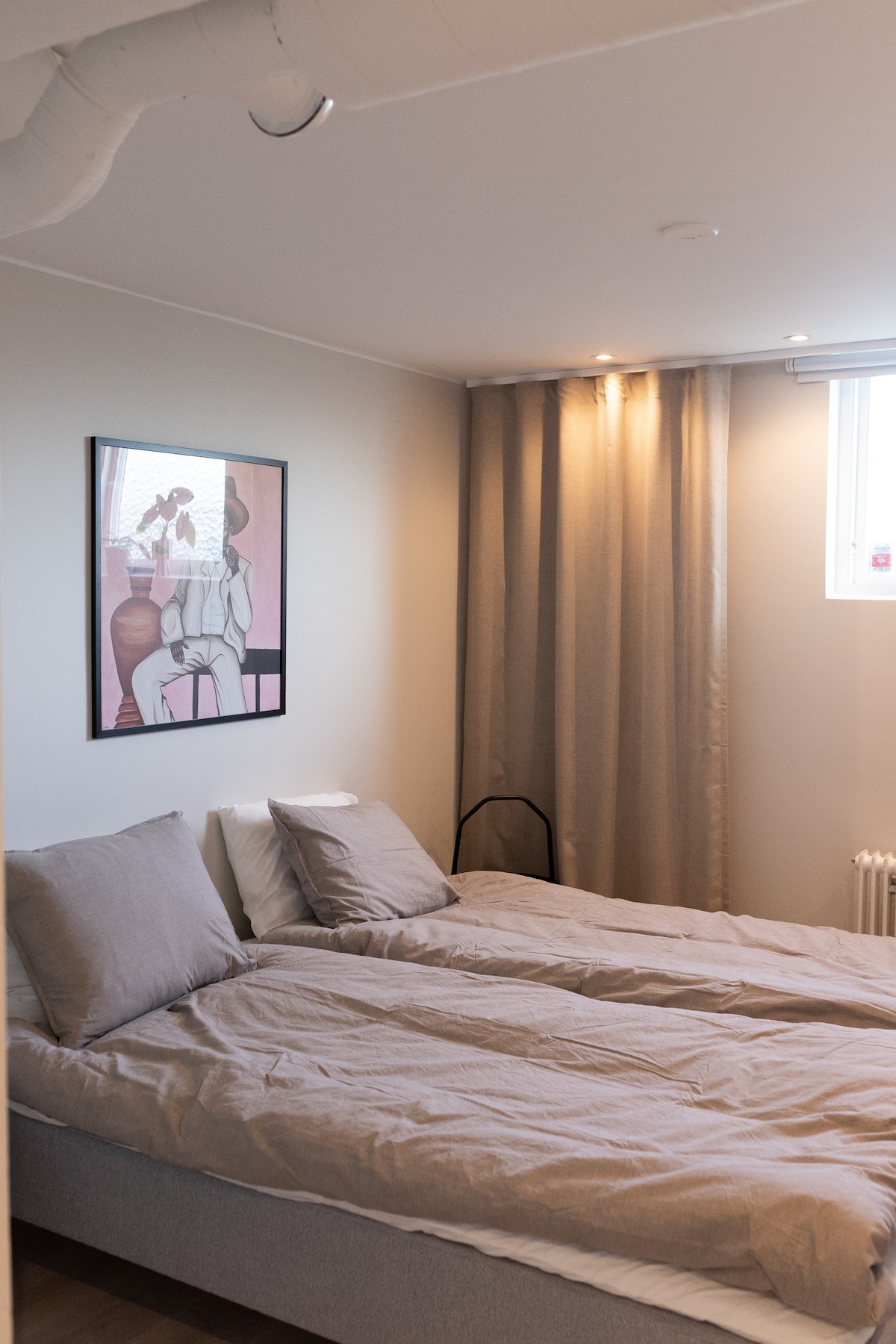 Bagong na - renovate at lubusang sariwang apartment na may mataas na pamantayan sa tahimik at magandang lugar. Ang apartment ay may dalawang magkakahiwalay na silid - tulugan na may ika -2 nahahati na 90 higaan. Ang bawat kuwarto pati na rin ang sala ay may TV na may malawak na pagpili ng channel pati na rin ang serbisyo sa pag - stream ng pelikula. Nilagyan ang kusina ng refrigerator, microwave, induction stove, oven, dishwasher at coffee machine. Washing/drying machine sa banyo Libreng paradahan na may posibilidad na bumili para sa pagsingil ng de - kuryenteng kotse. Malapit sa ilang hintuan ng bus.