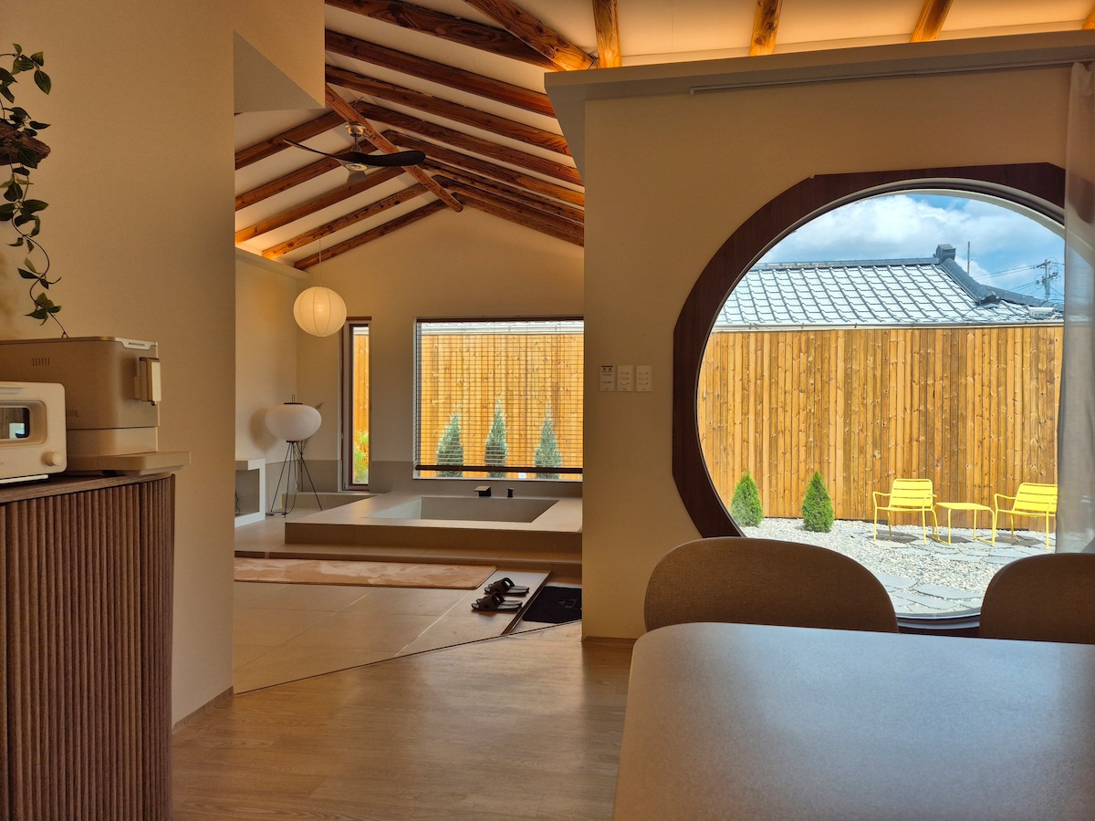 Sa kabila ng kahoy na bakod, isang mainit - init na pribadong bahay na may berdeng paghinga Ang ‘Stayryu’ ay isang tahimik na lugar na napapalibutan ng kahoy na bakod. Pribadong bahay na may berdeng hardin at komportableng init na kumukuha ng iba 't ibang liwanag kada panahon. Medyo pahinga ito mula sa iyong abalang buhay at binibigyan ka ng "oras para maging sarili mo." Magpahinga sa 🌿 kalikasan Maglaan ng isang araw sa isang independiyenteng lugar na may maliit na bakuran, mga puno, sikat ng araw, at simoy. 📍 Maginhawang lokasyon -3-5 minuto sa pamamagitan ng kotse sa mga atraksyong panturista Hwangridan-gil/Daereungwon/Donggung at Wolji/Museo/Woljeonggyo/Tradisyonal na Pamilihan - Malapit sa Bowhasa, Yeonha-deung Iseok Coffee Shop Mga Tagubilin sa Pag - access Pagtanggap: pagkalipas ng 3:00 PM Pag - check out: Noon kinabukasan (11: 00) Available ang pag - drop off ng 🧡 bagahe: mula 12pm 📍Mga Amenidad Jacuzzi (libre) Opsyon sa setting ng barbecue 30,000 KRW Maginhawang paradahan Balmuda toaster/makina ng kape (Starbucks) Dispenser ng tubig na yelo Standby Me/Dyson Airwrap/2 Speaker ng Marshall Beam Projector at Netflix Mga amenidad na kumpleto ang kagamitan. Upuan sa kainan para sa mga bata