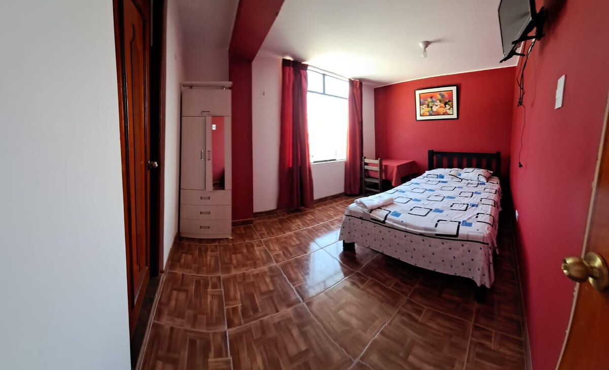 Komportableng kuwarto na may independiyenteng pasukan sa Nazca, na perpekto para sa mga mag - asawa, maliliit na grupo, at maliliit na pamilya. Matatagpuan sa unang palapag, nagtatampok ang modernong tuluyan na ito ng double bed, single bed, full bathroom na may mainit na tubig, maliit na sala, air conditioning, at Wifi. Kasama rin dito ang cable TV, access sa mga pinaghahatiang pasilidad sa kusina at paglalaba, at malawak na paradahan. Matatagpuan sa ligtas na lugar, 15 minutong lakad lang ang layo mula sa pangunahing plaza. Isang perpektong pagpipilian para sa komportable at nakakarelaks na pamamalagi sa lungsod.
