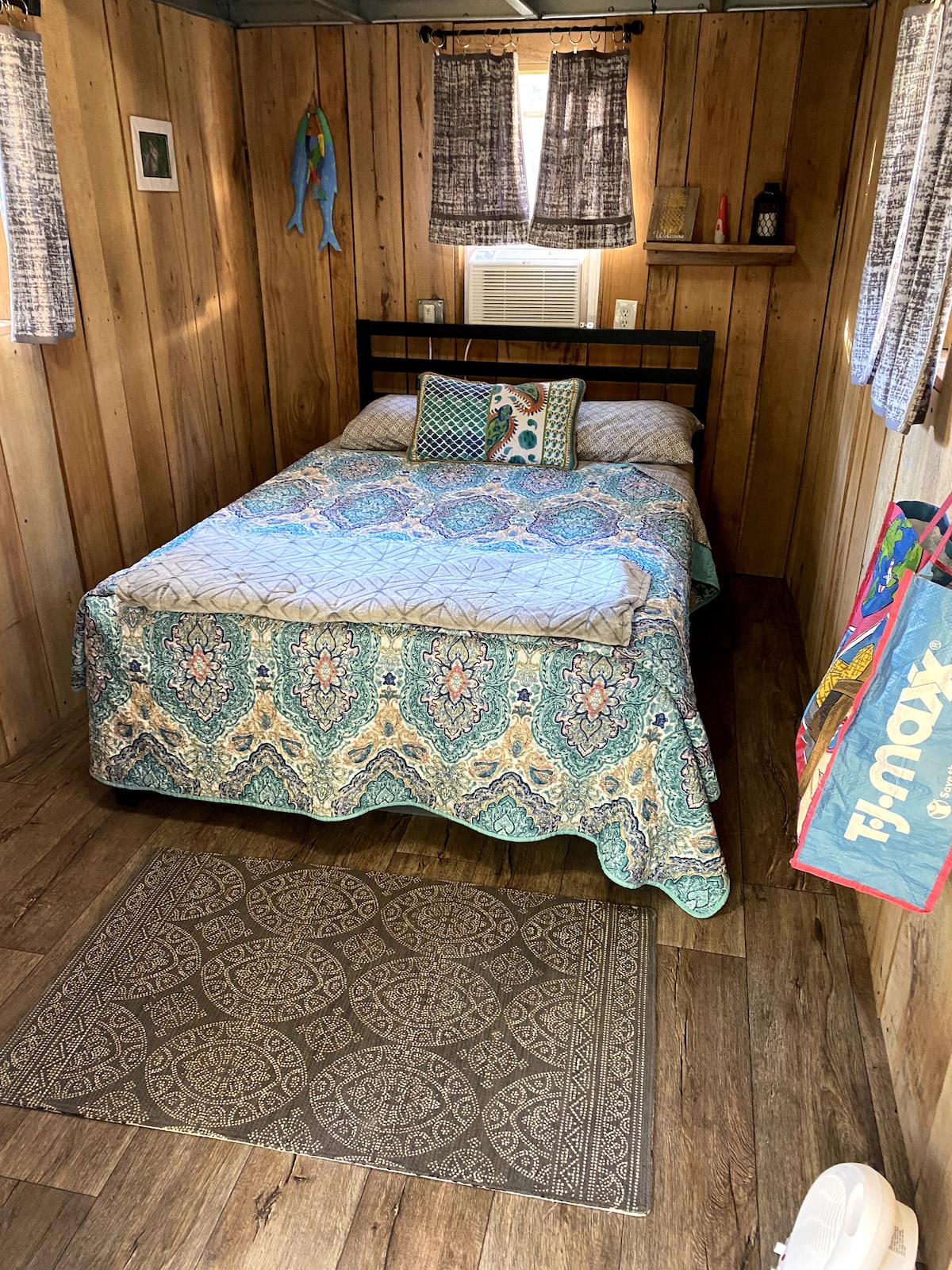 This Cute Cabin is perfect for glamping. Super clean bathrooms and a little community gazebo with fridge/micro just steps away. (This is 1 of 3 cabins we have that sleep two guests) Inside this air conditioned space - you'll find a comfortable full size bed for two, ceiling fan, ac, outlets. Off your back porch you'll find a fire pit and picnic table with privacy fencing on both sides of your cabin. This is the perfect place to watch a star filled sky and listen to the sounds of the night.