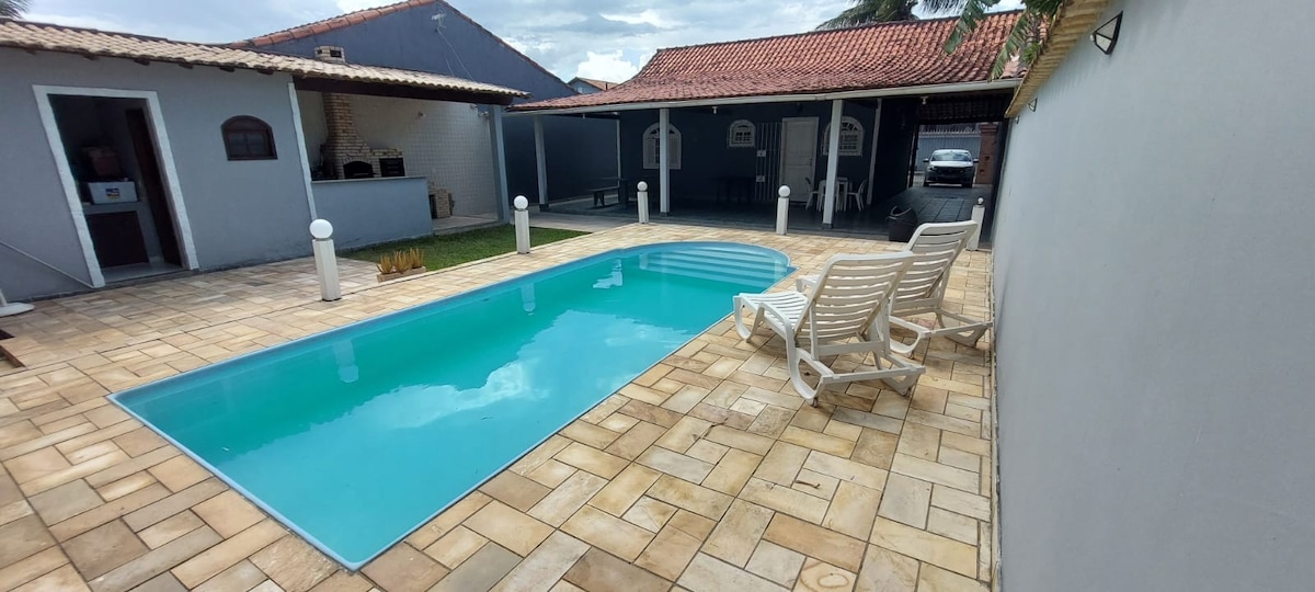 A casa tem 4 quartos, sendo 3 com AR CONDICIONADOS , portão automático, vaga pra 3 carros, conta com uma piscina de 6 mts, com uma parte para crianças pequenas com acompanhante , uma área coberta , churrasqueira com uma boa bancada e duas cubas para gelar as bebidas, mesa de sinuca e totó , dois banheiros externos (feminino e masculino ), dois banheiros internos , duas redes para descansar. Estamos a 25 km de cabofrio e 35km de arraial do cabo.