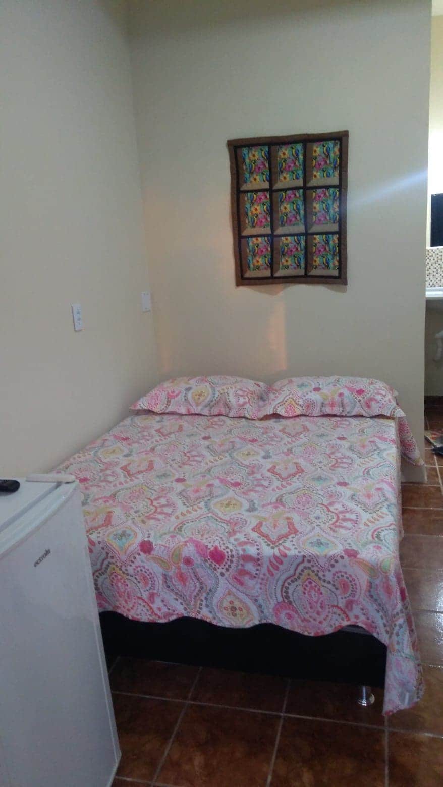 Natatangi ang tuluyan para sa mga bisita. Ito ay isang silid - tulugan na may banyo. Equipado com tv, wifi, naka - air condition, refrigerator, coffee machine, sandwich maker, bakal, pangunahing kagamitan sa kusina. Mainam ang tuluyan para sa dalawang taong bumibisita sa aming lungsod. Walang takip ang garahe, sa likuran ng bahay. Nakatira kami ng asawa ko sa likod ng bahay.
