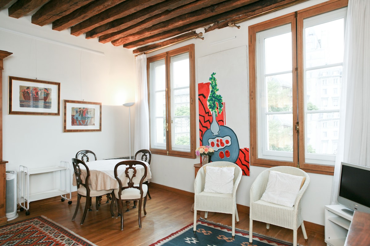 Ang tunay na karanasan ng mga Marais! Sa ika -5 palapag na walang elevator, ng 1648 mansyon, nag - aalok ang 50m2 apartment na ito ng magandang tanawin ng mga rooftop ng Paris. Ilang hakbang ang layo mula sa mga pinaka - masiglang lugar sa Haut - Marais, ginagarantiyahan nito ang kalmado ng isang tahimik na kalye at isang napapanatiling gusali. Pag - aari ito ng mga akademiko na mahilig sa mga lithograph at disenyo, katahimikan at konsentrasyon ng Bauhaus. Maraming libro, espasyo, kaginhawaan, modernong kagamitan: mahihikayat ng matutuluyang ito ang mga mahilig sa pamumuhay sa Paris.