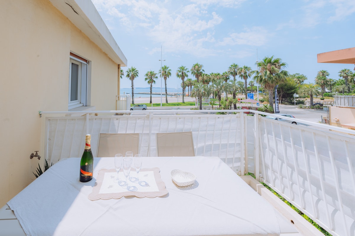 Apartment 28m², naka - air condition, tunay na paa sa tubig, na may pambihirang 180° tanawin ng dagat, na may Les Embiez sa kaliwa, sa tapat ng calanques, sa kanan ng bay ng Bandol at Sanary, at gabi - gabi, ang mahiwagang sunset show... Walang ingay, ang tunog lang ng mga alon mula sa Rayolet Beach (binabantayang beach na may direktang access). Malapit ang Port du Brusc at shuttle papunta sa Les Embiez. Komportableng apartment (wifi, LL, LV, Nespresso, ...) na may pribadong parking space.