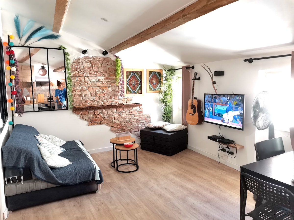 Magandang T2 na 25 m2 sa 1st floor ( nang walang elevator ) na may hiwalay na lugar na matutulugan, napakahusay na na - optimize na lugar. Na - renovate noong Hunyo - Agosto 2019. Dekorasyon na puno ng karakter na may mga orihinal na tile sa sahig, mga tile ng semento sa pasukan ng gusali, mga Moroccan na tile sa banyo. Magandang lokasyon, makasaysayang sentro ng lungsod na nakaharap sa 7/7 Clock Cafe. Mga de - kalidad na sapin sa higaan, mga materyales sa Mediterranean.
