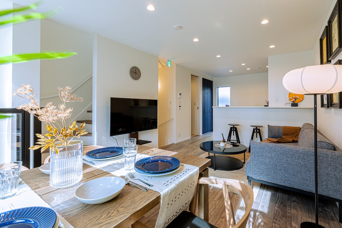 This is a major town within two kilometers of the center of Osaka's southern region.You can rent out the entire three-story house, which is about 200 m2 wide.Up to 9 people can stay in a comfortable and luxurious space different from the hotel suite. ☆Home elevator ☆A large bathtub with a shower of hot water ☆Two guest rooms with a shower room ☆Island kitchen ☆Special amenities I believe that they make your trip comfortable.