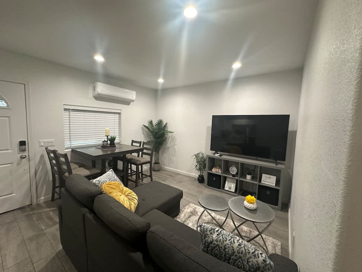 Welcome to our home, Enjoy: - 75" 4K Roku TV with Netflix, Prime, Hulu, Disney+ - 1 queen bed and 1 sleeper sofa (queen size) - Luxurious rainfall shower and modern bathroom - Fully equipped, stocked and clean Kitchen - Washer Dryer - Dedicated, Fast and secure WiFi (300 Mbps) - Dedicated Workspace - Self-check-in - Spacious closets - Steamer, Hairdryer, sanitizers - Dimmable warm lights for ambiance - Level 2 EV charger. - Convenient location near ECRMC, and shopping stores.