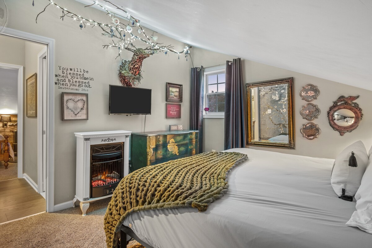 Maingat na idinisenyo ang kaakit - akit at komportableng kuwartong ito para sa kaginhawaan at pagpapahinga. May sariling pribadong pasukan ang kuwarto at nagtatampok ito ng komportableng queen bed, kitchenette, at full bath. Masiyahan sa mainit at nakakaengganyong kapaligiran na may malambot na ilaw, at mga pinapangasiwaang hawakan na parang tahanan. Mainam para sa mga solong biyahero o mag - asawa, matatagpuan ang tuluyang ito sa tahimik na kapitbahayan, malapit sa mga lokal na atraksyon, restawran, Wi - Fi, libreng paradahan, at libreng kape/ tsaa.