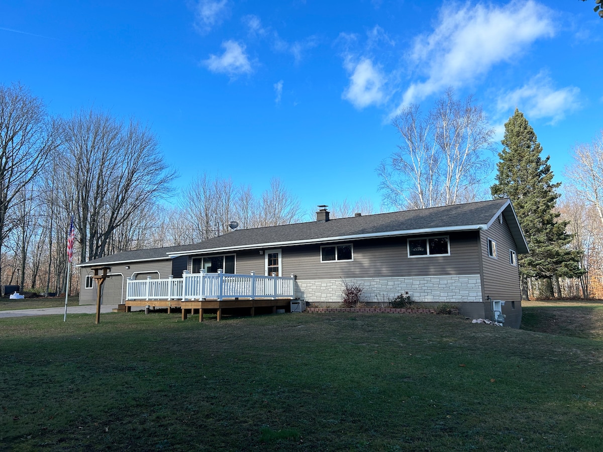 Magandang 4 na silid - tulugan na cabin na matatagpuan ilang minuto mula sa downtown Munising at sa pintuan sa Nakalarawan Rocks National Lake Shore. Ang cabin ay matatagpuan sa isang tahimik, sementado, puno - lined na kalye na matatagpuan sa 6 na tahimik na ektarya ng matigas na kahoy na kagubatan. Kami ay isang maikling biyahe sa M13 at ang lahat ng mga libangan sa mga lawa sa loob ng bansa na inaalok ng lugar. Tumungo sa kabilang direksyon at ikaw ay isang maikling 15 minutong biyahe sa Miners Castle/Miners Beach na maaaring maging isang kamangha - manghang launching point sa iyong UP adventure!
