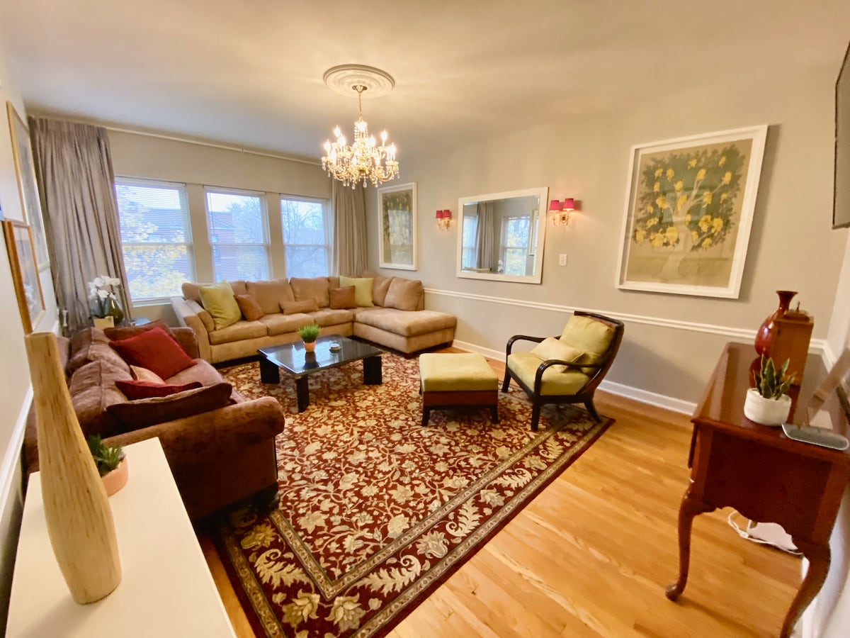 MGA LINGGUHAN AT BUWANANG DISKUWENTO!!! Masiyahan sa bagong inayos na LUXE 4 na silid - tulugan 1 banyong condo na ito sa buong ikalawang palapag ng dalawang flat na gusali! May LG Smart TV ang lahat ng kuwarto! Matatagpuan na may 5 minutong biyahe papunta sa The University of Chicago, Hyde Park, The Cultural Center, The Dusable Museum, at lalakarin papunta sa bagong Obama Library. 30 minutong biyahe papunta sa Midway airport 45 minuto papunta sa Ohare. 30 minutong biyahe ang layo ng downtown ng Chicago, McCormick Place, at mga museo. Matatagpuan ang 4 na bloke papunta sa Greenline Line