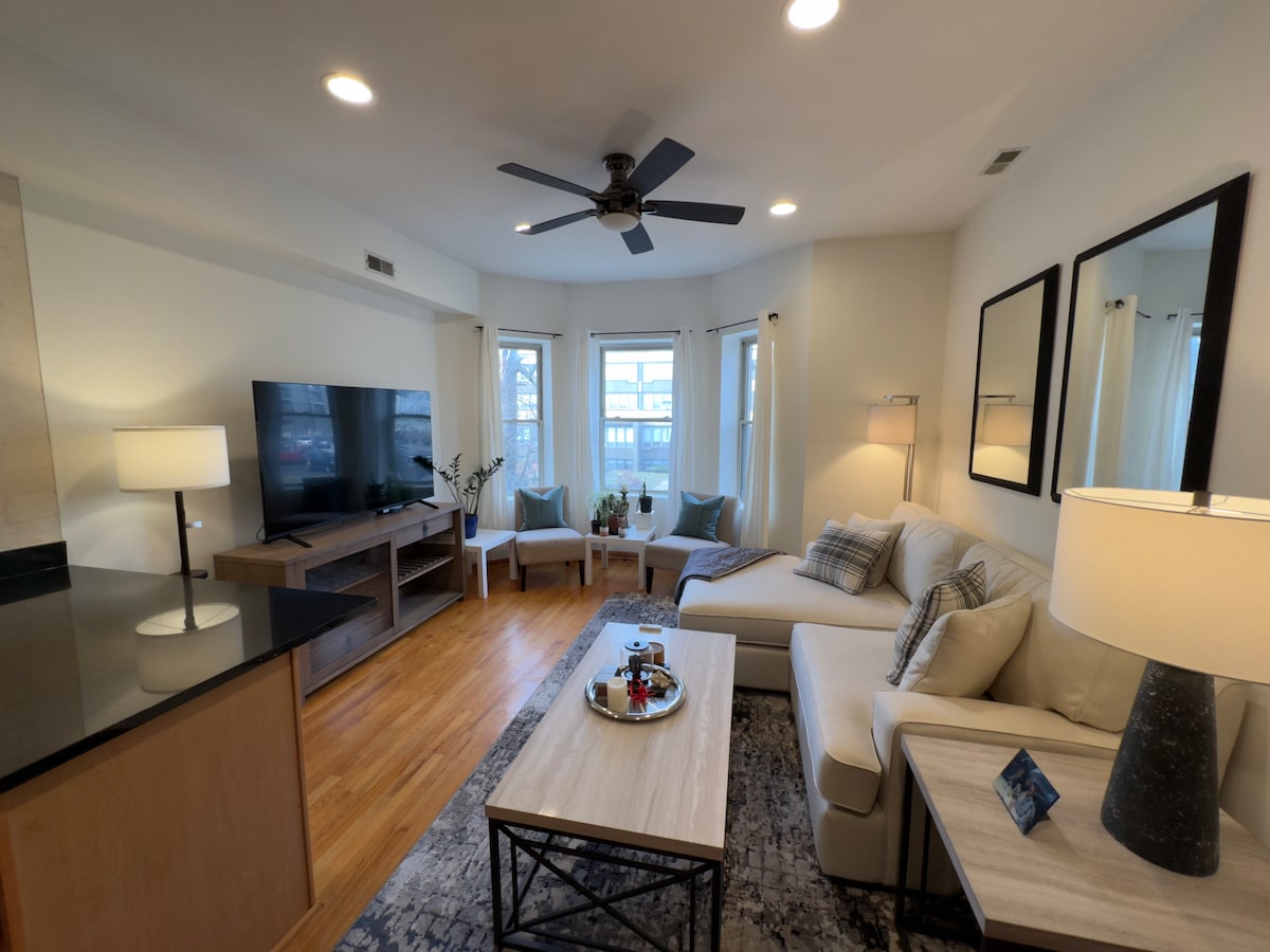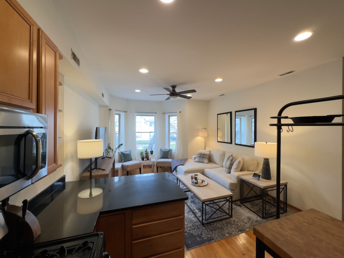 Maganda, maluwag, 1 bedrm, 2 bathrm condo malapit sa University of Chicago. Buksan ang floorplan, hardwd na sahig, hindi kinakalawang na kasangkapan, 2 Smart TV sa bedrm & living rm, in - unit na labahan, at pribadong paradahan. Nagtatampok ng komportableng reading nook at malaking patyo sa labas. Nasa tahimik na treelined na kalye - ilang minuto mula sa Hyde Park at nakakagising na distansya papunta sa Lake Michigan, Jackson Park Golf Course, 222,000sq ft Regal Mile Film Studios, at paparating na Obama Presidential Library. Ang iyong naka - istilong tuluyan na malayo sa bahay!