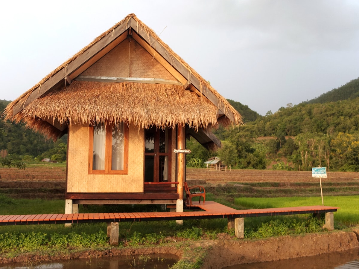 We keep it simple here. 1 km walk from Pai walking street. Peaceful setting tucked away from all the noise. Rise with rooster crowing in the morning with cat and dog playing in the garden, walk in the paddy field and feed the cow with banana during the day, and enjoy quite afternoon sun set. All cottages equipped with aircon and private bathroom. Simple breakfast toast, tea and coffee are available in the morning.