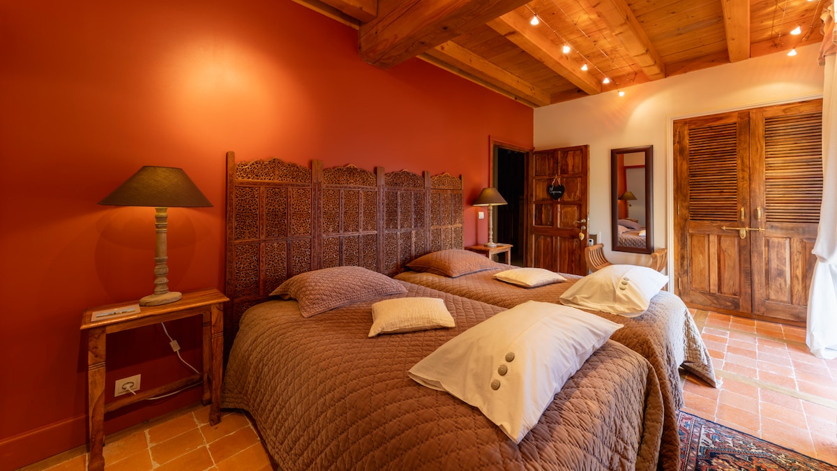 Mamalagi sa kastilyo nang isang gabi o higit pa, sa aming guest room para sa 2 taong may swimming pool at mga tanawin ng maburol na parke. Sa maliit na balkonahe nito, masisiyahan ka sa paglubog ng araw. Mayroon itong banyong may shower at toilet. Ito ay isang maluwang at maingat na pinalamutian na kuwarto sa estilo ng vintage. Puwede ka ring mag - book ng magandang table d 'hôte Bumisita sa châteaux ng Loire sa araw at samantalahin ang mga silid - tulugan ng kastilyo para magbasa, uminom ng tsaa, magpahinga.