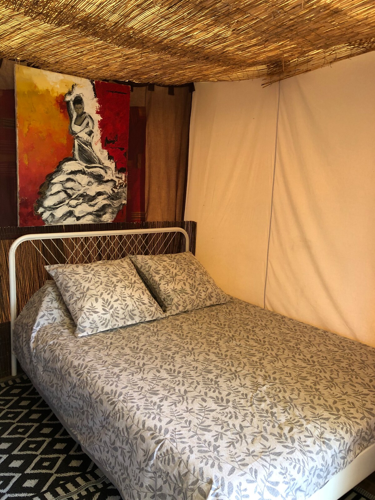 Nilagyan ng bedouin tent na may kasamang totoong double bed at mga single mattress, kaya nitong tumanggap ng hanggang 6 na tao. Mayroon din kaming mga baby cot na available kapag hiniling. May mga higaan at tuwalya. Mayroon kaming kampanilya na 4 ang tulog sa aming site Nakakamangha ang paglubog ng araw. Napakaganda rin ng mga bituin dahil may minimum na polusyon sa ilaw. Malinaw na nakikita ang Milky Way tuwing walang ulap na gabi. Humiga ka lang, titigan mo ang langit sa loob ng ilang minuto at makakakita ka rin ng shooting star!!!