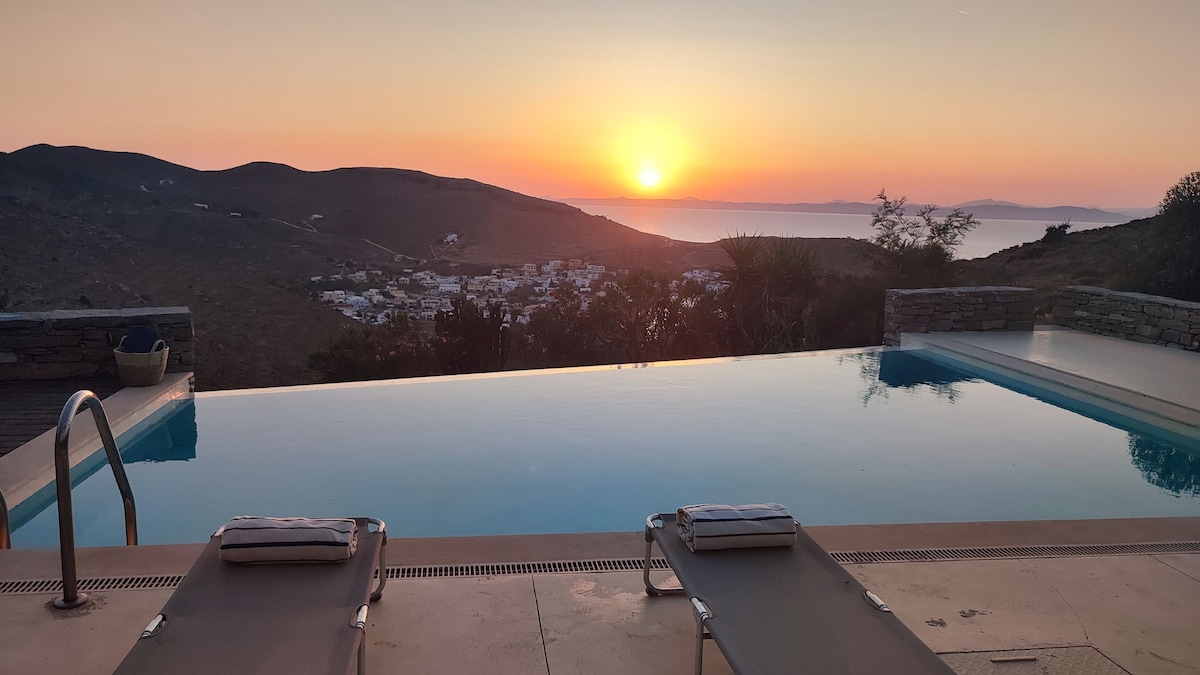 Beautiful Kea Island seafront 3BR 3BA villa with private pool. Endless sea views & private secluded bay with swimming cove just steps from expansive patio & pool area. Common area of villa has living room and kitchen and one bedroom and full bathroom; lower level of villa has two additional bedrooms each with exterior entrances and en suite full bathrooms. Great privacy for couples or families with older children. Truly spectacular location just 10 minutes from Kea port; short ferry from Athens.