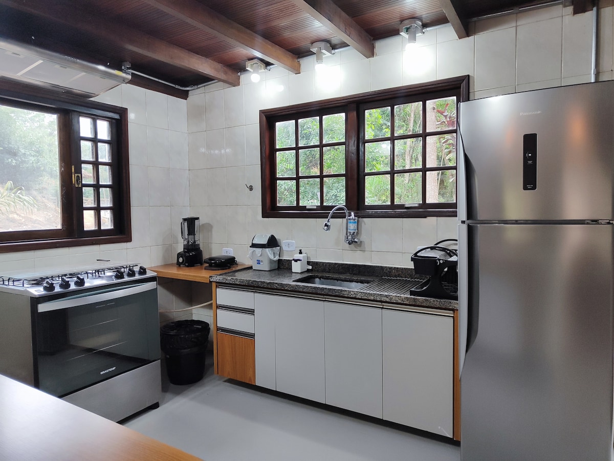 Relaxe neste espaço calmo e cheio de estilo. São 02 quartos sendo um com vista aberta para mata ambos com camas Queen, ventiladores e uma tv. Nossa cozinha é completa e equipada para o maior conforto e comodidade. Ótima localização, próximo ao centro do bairro, supermercado e restaurante. Nosso espaço é cercado de árvores e pássaros, ambiente rústico e cheio de detalhes, para quem busca real contato com a natureza.