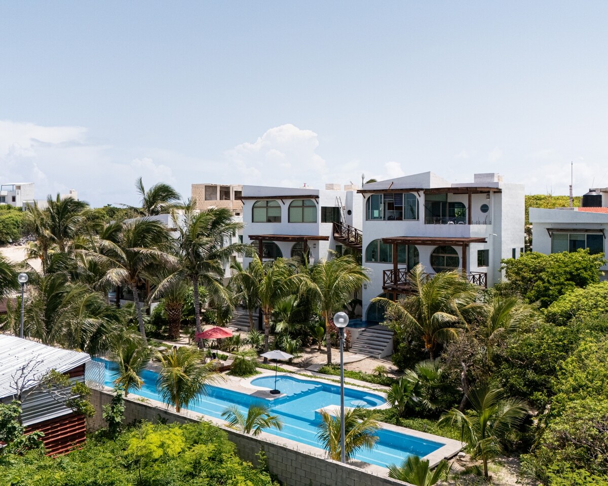 Tumakas sa isang villa para sa 6 na may pool at rooftop na ipinagmamalaki ang mga nakakabighaning tanawin ng dagat. Masarap na almusal o tanghalian sa Mayakita, ang aming restawran ay ilang hakbang lang mula sa iyong pinto. Sa gabi, bumalik sa iyong rooftop sa ilalim ng starlit na panorama ng karagatan o magpakasawa sa tunay na lutuing Italian sa tabi. Recharge in the serene Punta Sur and wake up to the most epic sunrise in Quintana Roo - your ultimate getaway starts here