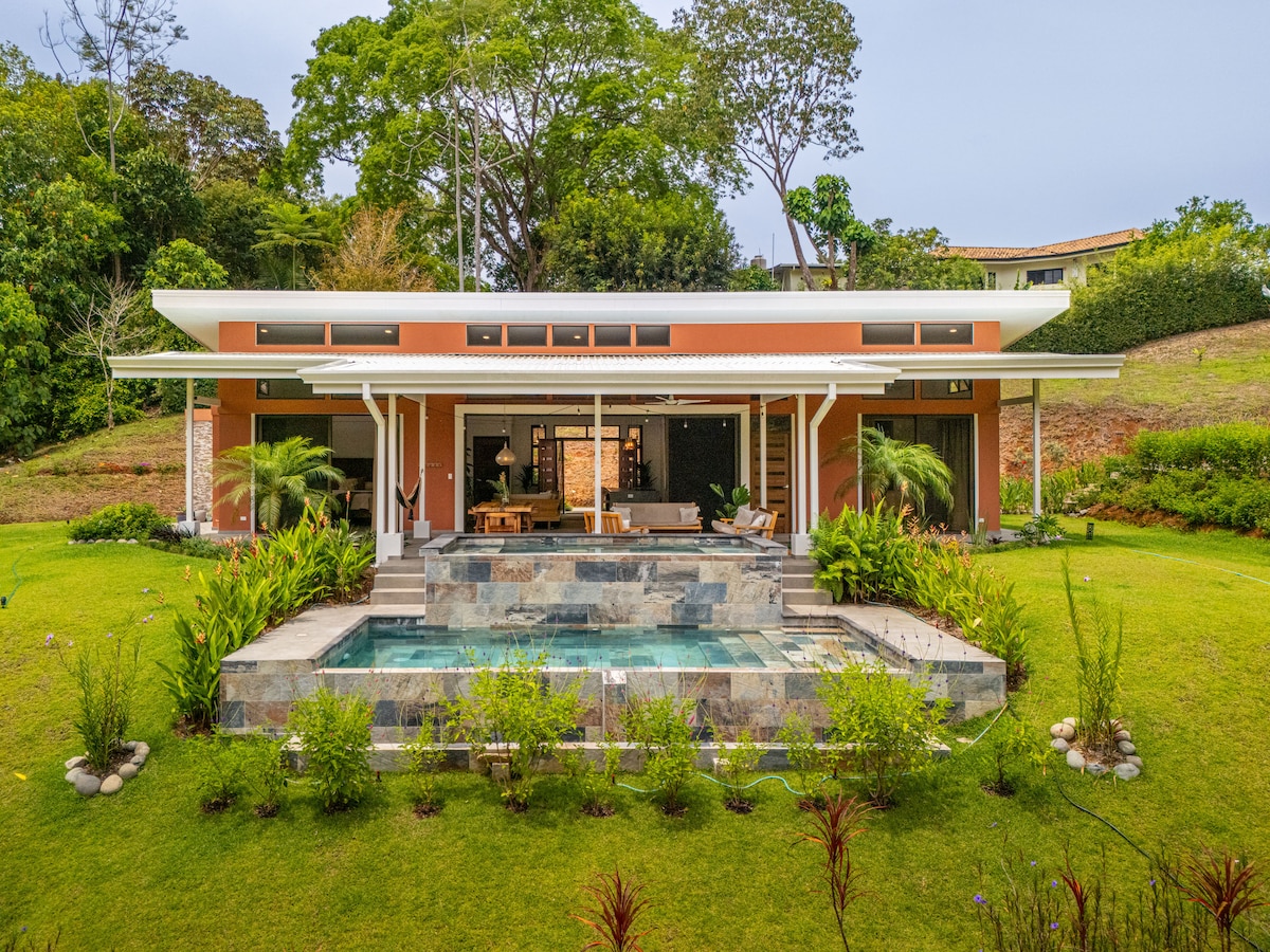 Magugustuhan mo ang privacy ng Casa Mariposa, katahimikan at kamangha - manghang tanawin ng Karagatang Pasipiko at kagubatan. Ang eleganteng, marangyang, gated, at komportableng bahay na ito na may 5.5 acre ng rain forest ay 700 talampakan sa ibabaw ng dagat sa isang tahimik na komunidad malapit sa Parque National Marino Ballena. Malapit sa dose - dosenang restawran, paglilibot, tindahan at napakarilag na beach, na may maginhawang 8 minutong biyahe mula sa beach highway, kinakailangan ang 4x4. Padalhan ako ng mensahe para ayusin ang aming concierge ng mga pinapangasiwaang tour, pribadong chef at spa service!