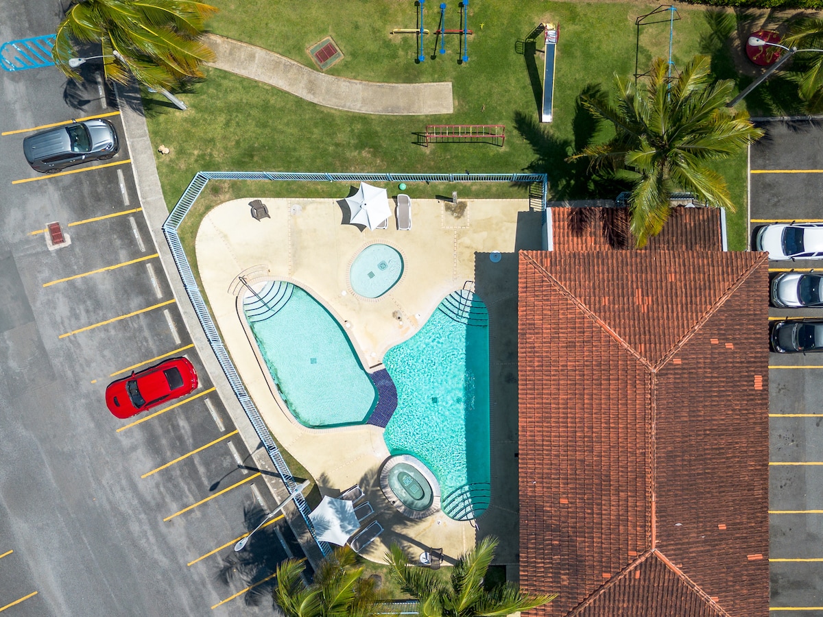 Prime oceanfront location, 4 na minutong biyahe lang ang layo mula sa International Airport. Sa tabi ng mga marangyang hotel, nag - aalok ang studio na ito ng madaling access sa mga restawran, 24 na oras na botika, at mga grocery store. Ang beach ay nasa labas mismo ng iyong pintuan. Kamakailang na - remodel, nagtatampok ang studio ng queen bed at buong sofa bed. Masiyahan sa mga premium na amenidad ng hotel kabilang ang pool, gym, at 24 na oras na laundry center. Nag - aalok ang kumpletong kusina at kaakit - akit na hapag - kainan ng mga tanawin ng karagatan at rainforest.