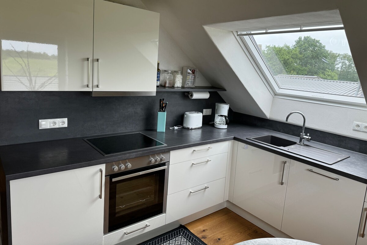 Maliwanag at maluwang, na may higit sa 50m2, may sapat na espasyo para sa isang marangyang pananatili para sa 2 tao. Ang kusina, silid, banyo, hiwalay na banyo at silid-tulugan ay bago at maluho. Nilagyan namin ang independent studio ng mga de-kalidad na materyales. Tulad ng gusto mo sa sarili mong tahanan. Kahit na hindi kami naghahain ng almusal, palagi kaming nagbibigay ng refrigerator na puno ng ilang inumin, mantikilya, yoghurt/kwark, itlog, at jam sa pagdating. Mayroon ding mga cereal, mantika/suka, asukal, kape at tsaa.