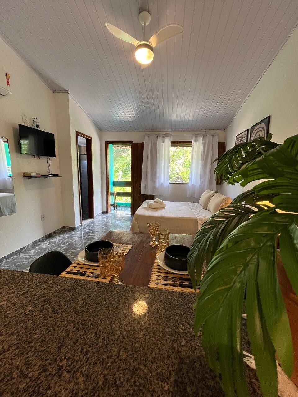 Private 420 ft² apartment in Vila Real with a private balcony and Mexico-inspired décor. Quiet location surrounded by nature, just 900 meters from the city center. Includes Wi-Fi, Netflix, air conditioning, garage, and shared access to a terrace with swimming pool and sea view. Full kitchen, stylish living room with HD TV, luxurious double bed, comfortable double sofa bed, and spacious bathroom with excellent shower. Parking available on the property. Follow: @vilareal_itacare