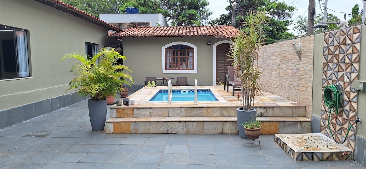 Halika at gumugol ng mga hindi malilimutang sandali kasama ang iyong pamilya. Bagong inayos na bahay, 2 naka - air condition na kuwarto, 1 suite, 2 bloke mula sa pinakamagagandang beach sa karagatan ng Niterói. Bahay na may swimming pool, duyan, barbecue, shower, balkonahe na may malaking mesa para sa mga panlabas na pagkain at lahat ng kagamitan, at magandang kapaligiran. Ang buong estruktura na may magandang tanawin at 2 bloke lang ang layo mo sa beach.