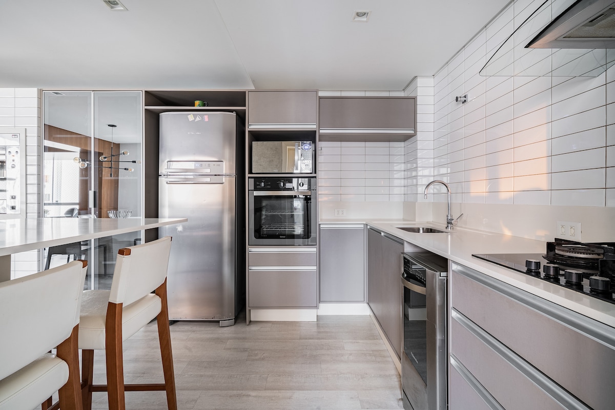 Lounge apartment na matatagpuan sa Brava Beach at 10 minuto ang layo sa Balneário Camboriú. Perpekto ang lokasyon. 5 bloke lang papunta sa beach. Isara ang lahat ng party at restawran. Condo na may kumpletong imprastraktura, pool, gym, steam room, at 4 na ihawan. May Jacuzzi sa apartment na nakaharap sa bundok at may hydro at chromotherapy. Mainam para sa pagrerelaks o paglalaan ng romantikong panahon. Mayroon itong 58‑pulgadang smart TV sa sala at 40‑pulgadang smart TV sa kuwarto. Kumpletong kusina. May washer at dryer. Magugustuhan mo ang lugar na ito.