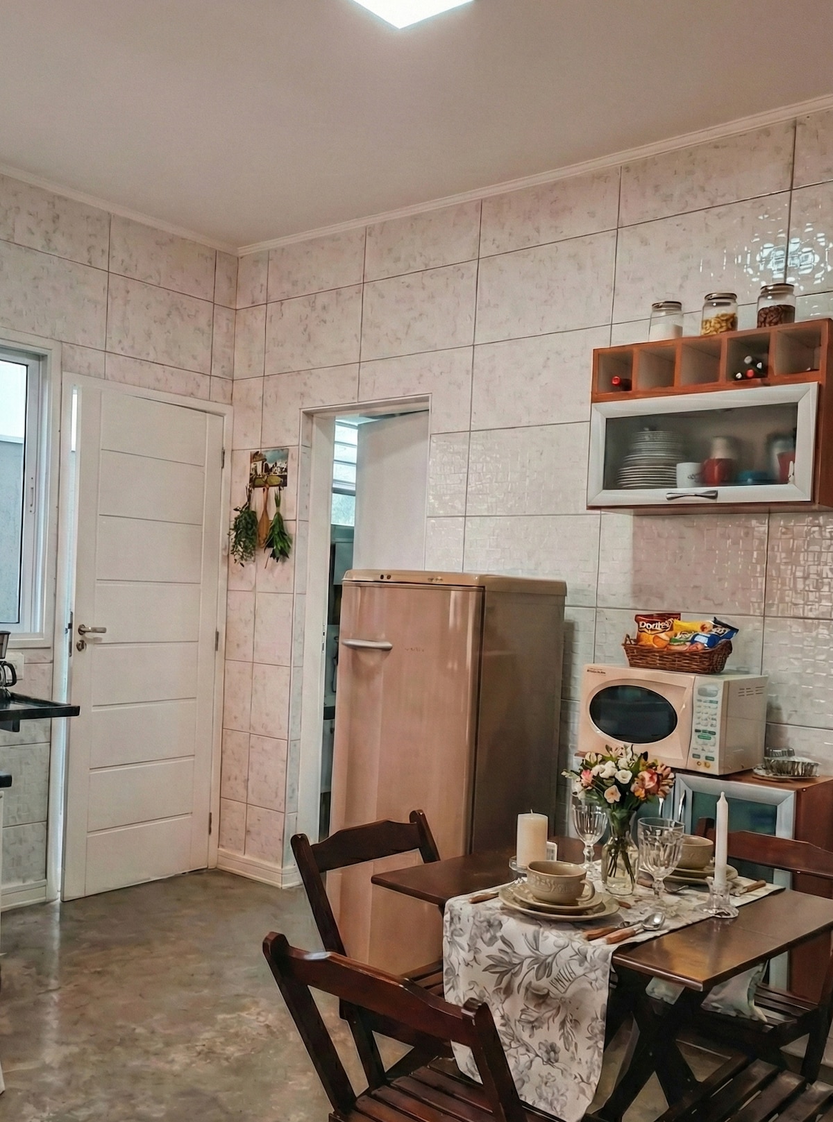 A casa conta com, sala e quarto integrados, banheiro, cozinha americana com todos os utensílios para preparo de refeições ou um churrasco, na área externa temos uma churrasqueira, pia e mesa de quatro cadeiras, uma piscina pequena (1 metro de profundidade), garagem fechada grande( 30m²) porem só cabe um carro devido a lavanderia no mesmo espaço, e jardim com plantas e arvores frutíferas, tenho um aquário e um viveiro no quintal que cuido todos os dias pela manhã.