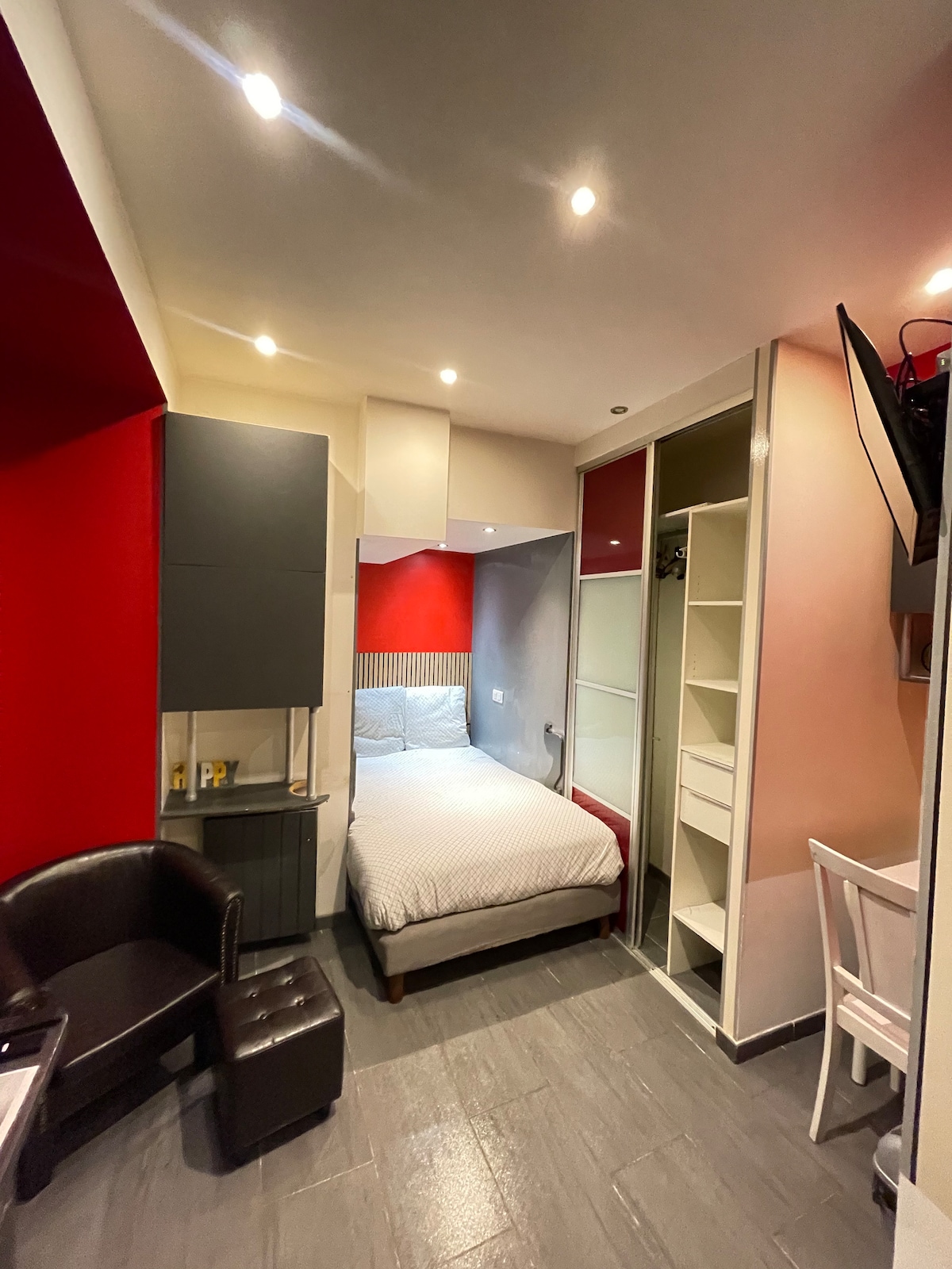 Napakatahimik na apartment na matatagpuan sa itaas na palapag ng isang bagong gusali, na may dalawang napakagandang maliit na terrace. Binubuo ito ng kusina na bukas sa sala, kumpleto sa dishwasher, malaking banyong may shower at toilet, at kuwartong may temang " Full Black" na nagbibigay ng touch ng pagka - orihinal sa apartment na ito. Puwede ring baguhin ng isa ang maliwanag na kapaligiran salamat sa switch na matatagpuan sa bawat kuwarto ng apartment. "NATATANGI"