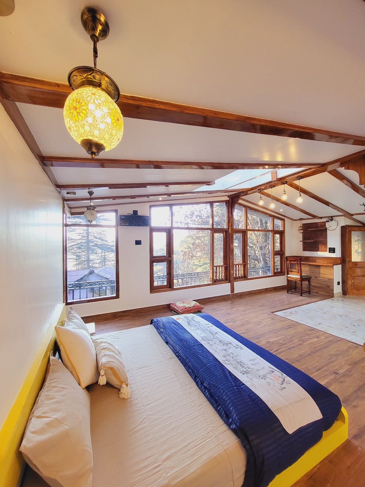 Welcome to our cozy yet luxurious attic home. If majestic views, arty decor, and retro chic is your vibe then this homestay is for you. It is a perfect combination of art and luxury while being super comfortable. This is most luxurious offering from Shimla Gypsy. Placed on the top of our house with a 360° and sky view, it has all the comfort of a mountain house to offer, amidst nature.
