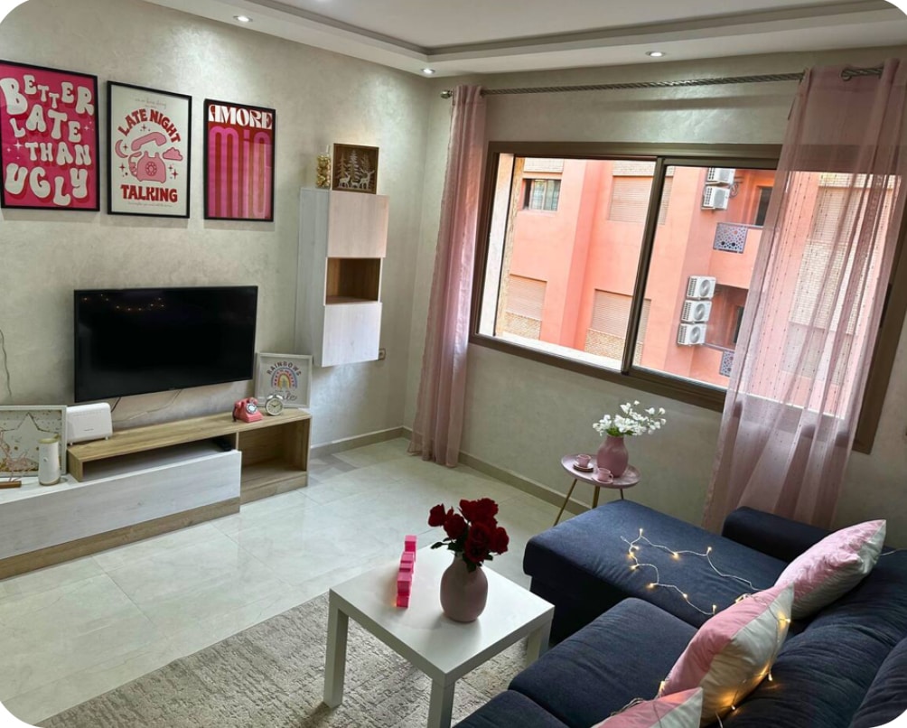 Welcome to this beautiful apartment in Marrakech, A bright living room with a touch of modern Moroccan décor A fully equipped kitchen Nespresso machine High-speed fiber optic Wi-Fi.60” Smart TV Netflix 3 air conditioners for year-round Key box for self check-in Just 2 minutes from McDonald's Drive and 10 minutes from Jemaa el-Fna Surrounded by shops, restaurants gym and supermarket Easy access to public transportation and main roads