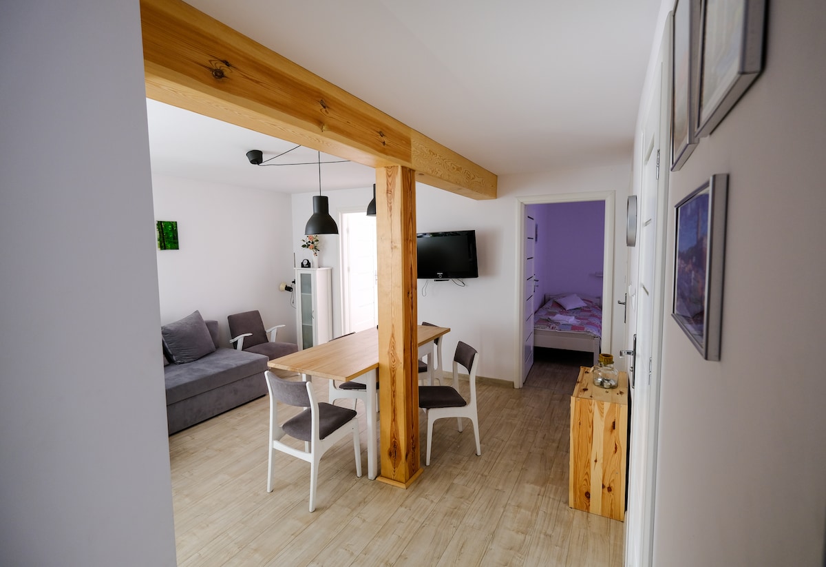 Inaanyayahan ka namin sa aming apartment. Mayroon itong komportableng tulugan para sa 6 na tao. Ang apartment ay binubuo ng 2 silid - tulugan na may dalawang single bed bawat isa (para sa iyong kaginhawaan, tiniyak namin na maaari mong pagsamahin ang mga ito sa malalaking kama, magpasya kung ano ang kailangan mo). May malaking double sofa bed at flat screen TV ang sala. Ang apartment ay may kusinang kumpleto sa kagamitan (dishwasher, espresso machine, microwave, refrigerator, oven) at banyong may shower at pinainit na sahig.