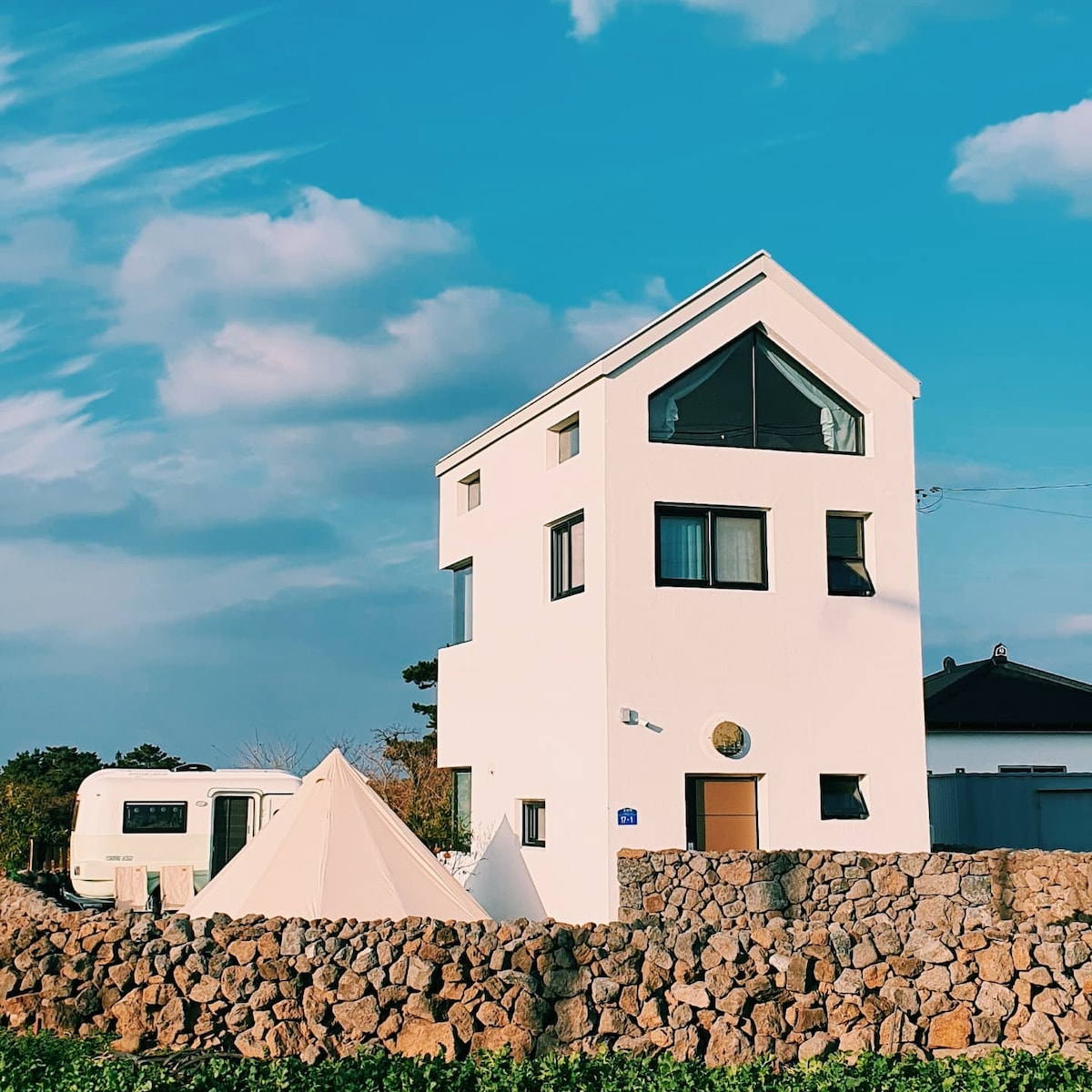 Isang maliit na nayon sa kanluran ng Jeju Island, isang maliit na bahay na matutuluyan ngayon Available ang mga karanasan sa emosyonal na camping at caravan sa outdoor courtyard. Ang pinakamagagandang sunset at kakaibang puting windmill sa Jeju Magpahinga para sa buong pamilya sa isang tahimik na tahanan.