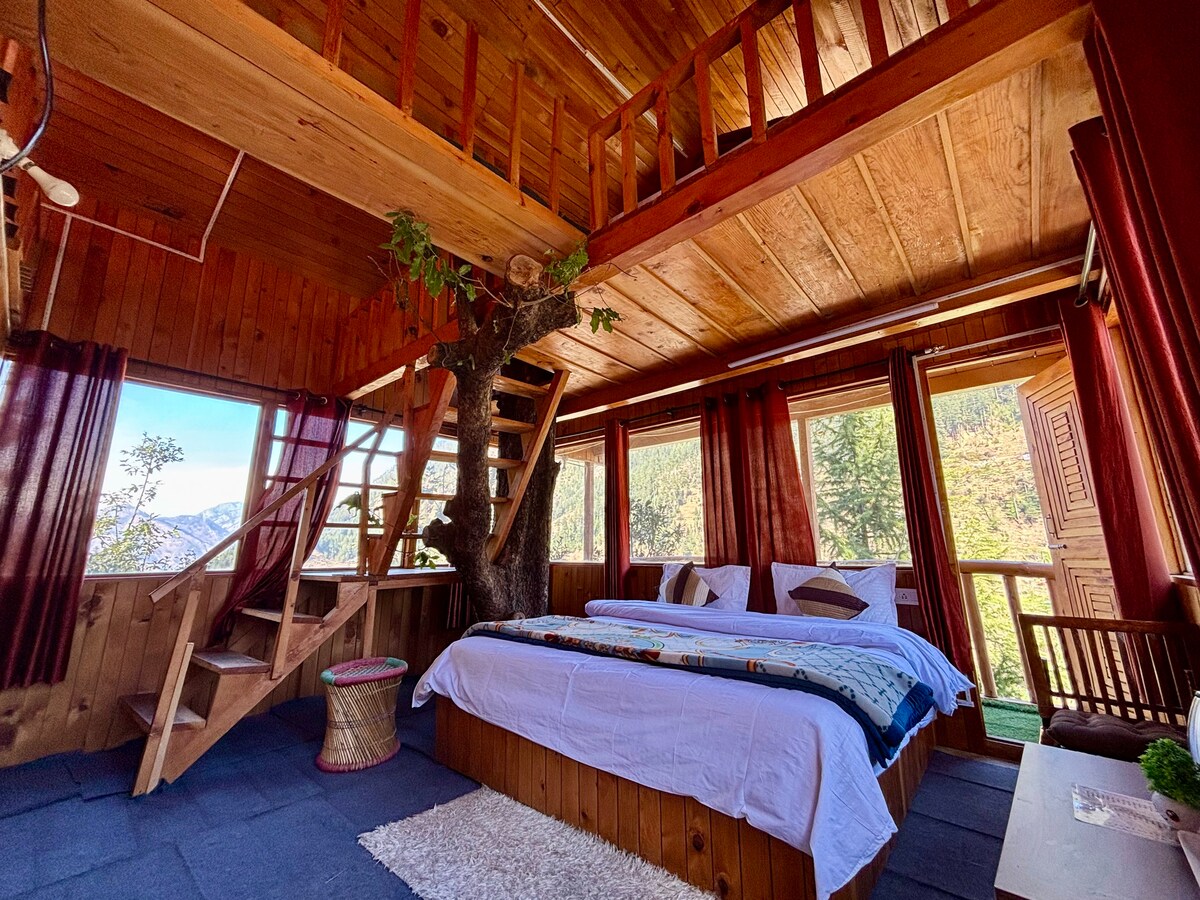You'll love this unique and romantic escape in Jibhi Valley. Our Spacious and Lavish treehouse offers comfort of modern amenities and joy of nature. ★ Wooden & Glass Architecture ★ Panoramic view ★ Scenic Location ★ Wi-Fi ★ Power Backup ★ Food service ★ Bonfire area ★ Parking at property Please note, Breakfast, Room heaters, Bonfire & other services are exclusive of stay price.