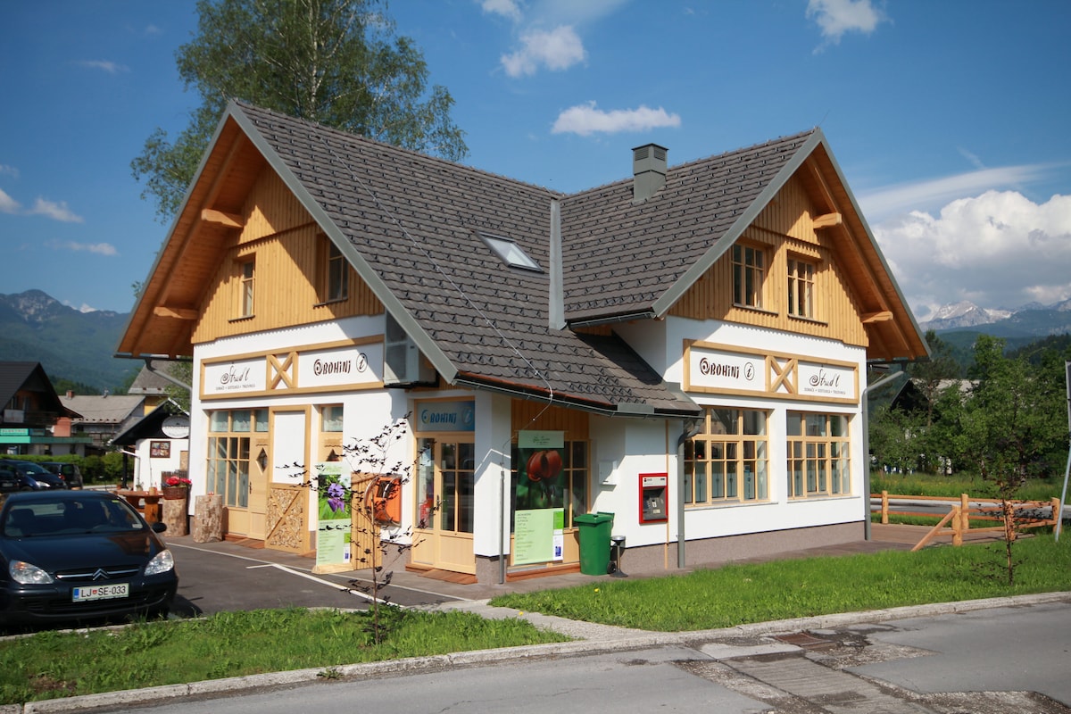 Homestead Log v Bohinju is located approximately halfway between Lake Bled and Lake Bohinj on the right side of the Sava Bohinjka river. It is a large old farm building consisting of a living area, a stable, a barn, a dairy and other auxiliary rooms. The living part of the building was completely renovated and adapted for tourist purposes. All units are furnished in a modern style with new furniture and renovated bathrooms. We are no longer actively engaged in agriculture.