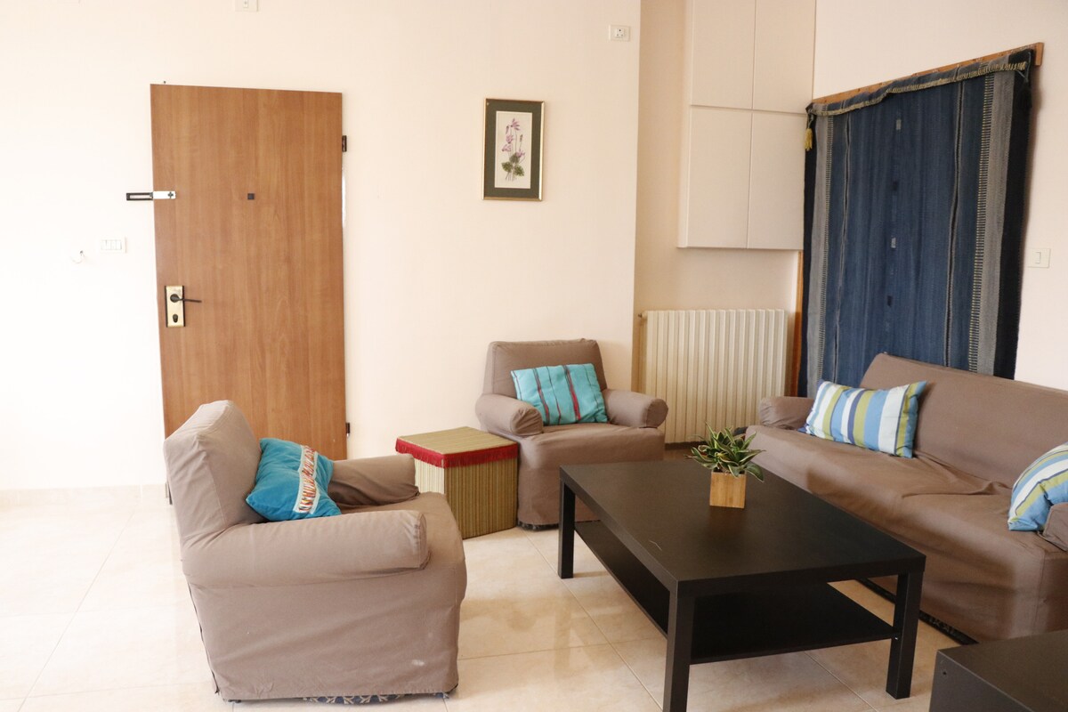 Studio apartment na may libreng paradahan sa isang tahimik na kapitbahayan na may magandang hardin. Napakadaling ma - access ang pampublikong transportasyon . Gayundin, mayroong supermarket at grocery store na 3 minuto ang layo sa pamamagitan ng paglalakad. Ang apartment ay nahahati sa pagitan ng isang pag - upo at isang lugar ng pagtulog, isang hiwalay na kusina, at isang maaraw na lugar ng kainan /pag - upo. Ang studio ay maaaring matulog ng dalawang tao nang kumportable: dalawang single bed . Available ang home made Palestinian Breakfast at Middle Eastern meal kapag hiniling.