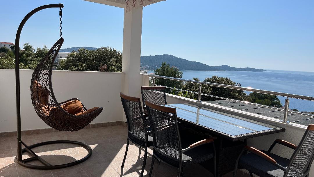 Matatagpuan ang apartment sa Tisno na may maigsing lakad mula sa sentro ng nayon, na matatagpuan sa ikalawang palapag ng bahay, na binubuo ng silid - tulugan na may double bed, living area na may kitchenette at dining table, seaview balcony at banyo. Nilagyan ito ng 1 aircon at wifi. Si Max ay 2 tao. Ang paradahan ay ibinibigay para sa 1 kotse. Mula 23:00 ᐧ 8: 00 p.m. ay oras ng kapayapaan sa gabi, kaya ikinalulugod mong hindi maistorbo ang ibang bisita. Ang distansya mula sa site ng pagdiriwang ay 15 -20 minutong lakad. Walang mga taga - labas. Walang party.