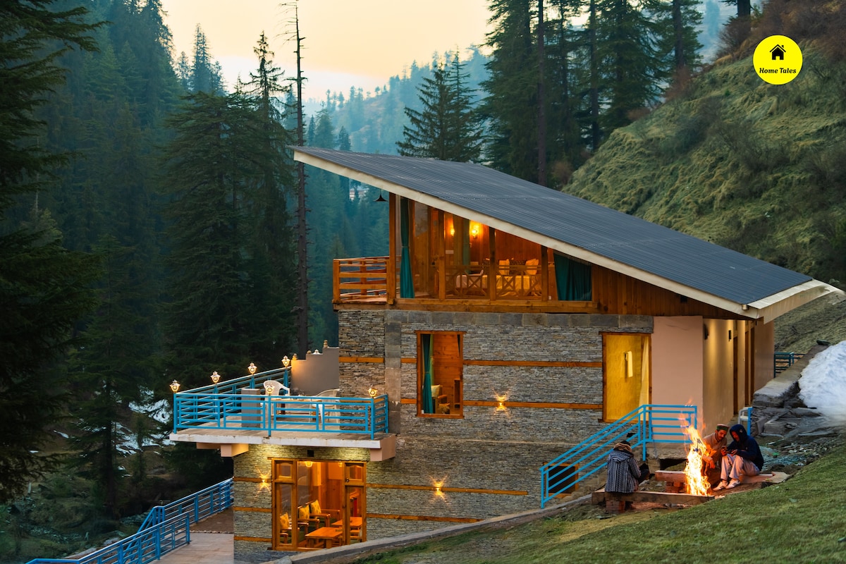 Bumalik at magrelaks sa tahimik at naka - istilong tuluyan na ito. * Wifi * Power Backup * Serbisyo sa pagkain at tagapag - alaga * Pribadong hardin * Arkitektura ng pinewood * Ligtas na Paradahan * Mga lokal na tip * Bonfire Pakitandaan - May 500 mtrs trek mula sa paradahan papunta sa property, Pipiliin namin ang iyong bagahe. - Kasama lang sa presyo ang pamamalagi. Almusal, Mga Pagkain, Mga heater ng Kuwarto, Bonfire at Lahat ng iba pang mga serbisyo ay hindi kasama.