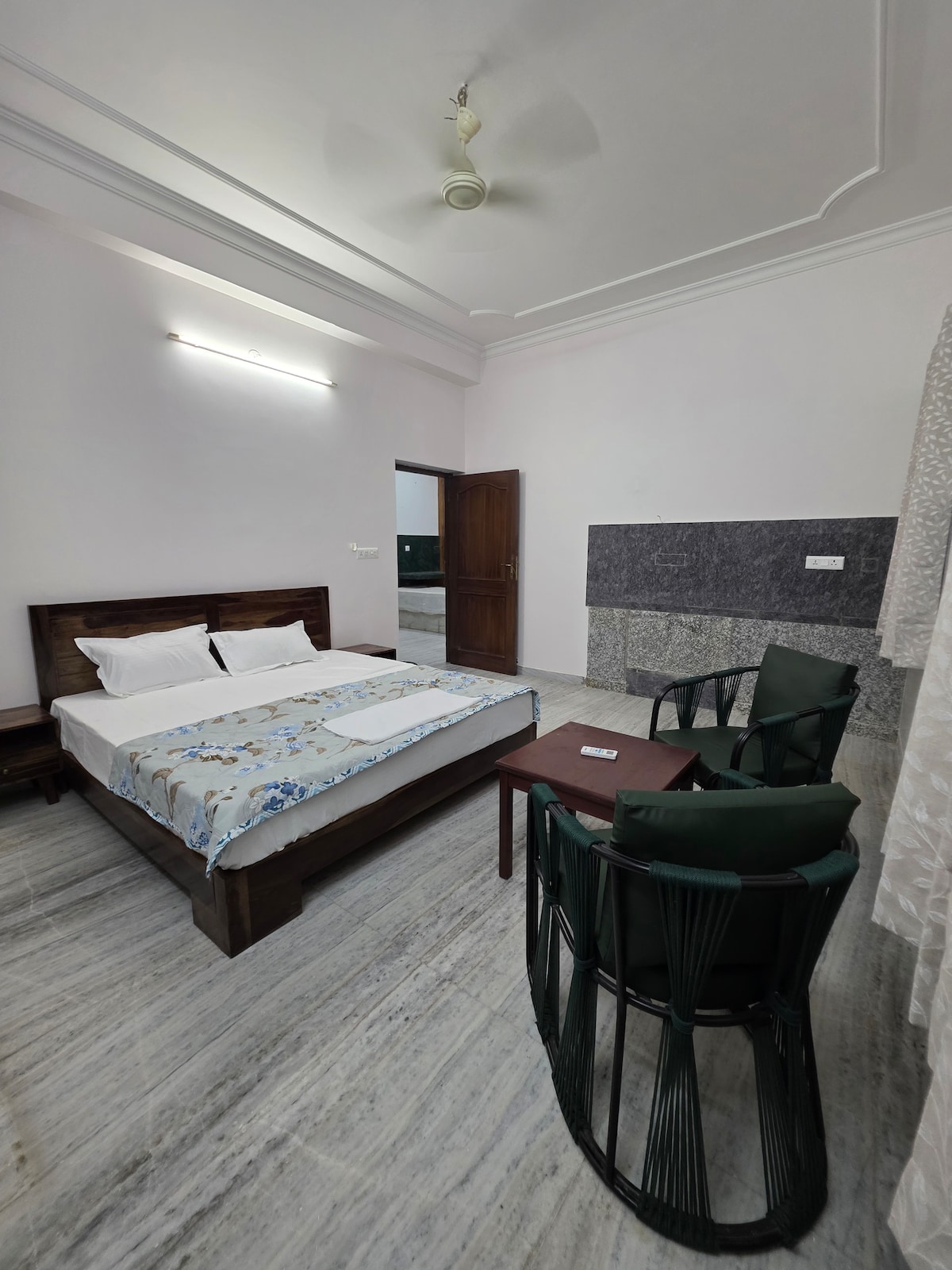 Step into royal comfort at Sajjan Niwas. This spacious king-size room blends heritage charm with modern luxury, featuring air-conditioning and an attached private luxury bathroom for a truly relaxed and regal stay.