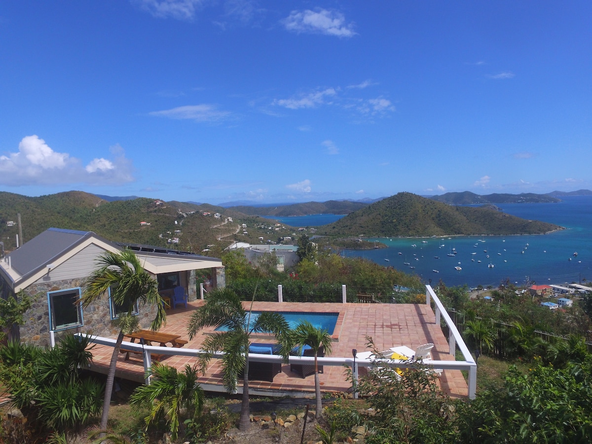 Magandang Cottage na may 180 degrees ng mga tanawin ng puting tubig. Makikita at maririnig mo ang mga nag - crash na alon sa ibaba. A/C, Pribado , Romantiko na may napakarilag na shower sa labas. Mag - spoon sa isang pugad ng pagiging matalik. Isawsaw ang iyong sarili sa mga simoy ng isla. Tingnan ang mga tanawin ng sumisikat na araw at buwan habang kumikislap ang mga ito sa mala - kristal na tubig ng Hurricane Hole. Mamalagi sa ritmo ng buhay sa Isla gamit ang solar energy at purified rainwater, mga mapagkukunan na rekomendasyon, payo at mga tip ng insider. Maligayang pagdating sa simpleng kagandahan.