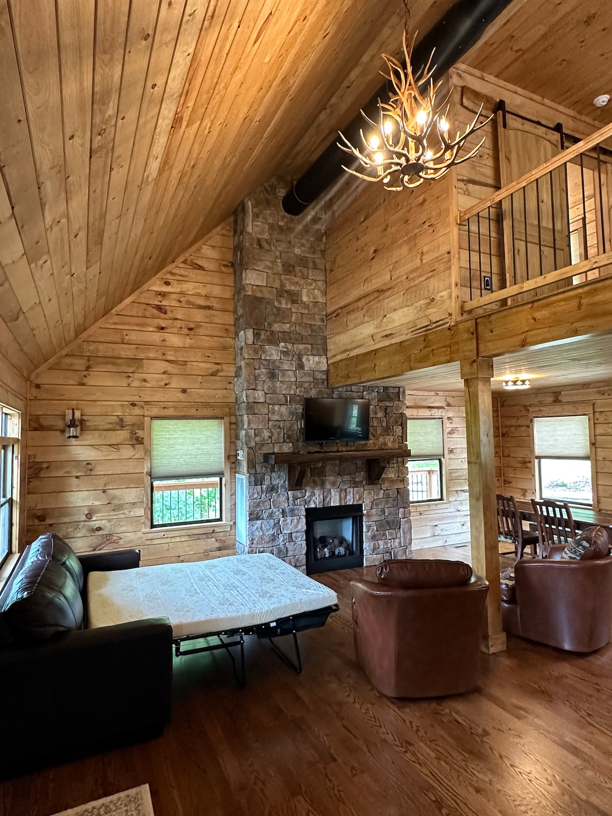Matatagpuan sa gitna ng mga puno, ang Blue Haven Log Cabin ay nasa ibabaw ng isang kiling na burol at tinatanggap ang mga naghahanap ng perpektong bakasyunan na iyon upang kumonekta sa mga mahal sa buhay alinman sa malaking front porch na may tanawin ng mga bundok o sa patyo sa ibaba. Ang isang stone fireplace at rustic furniture ay nagbibigay dito ng pakiramdam ng mga araw na nagdaan . Ang malaking stained glass window sa eave ng 22 foot cathedral ceiling ay naglalabas ng bawat hue ng asul papunta sa kisame, loft at sahig sa iba 't ibang oras ng araw. Mag - host sa tabi ng pinto kung kinakailangan.