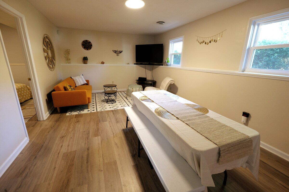 Idinisenyo ang bagong ayos na tuluyan para sa mga biyaherong ayos lang sa mas maliit na tuluyan na may malinis at minimalist na disenyo, AT insulated na pinto ng garahe na mabubuksan mo kapag maaraw! Magparada sa tabi ng pasukan, i‑plug in ang EV charger mo, at maglakad‑lakad papunta sa mga restawran, museo, at venue ng konsiyerto. Gayundin, kung mas malaki ang grupo mo, kayang tumanggap ng hanggang anim na bisita ang nakakabit na bahay. Bibiyahe sa Raleigh para bumili ng bahay? Puwedeng LIBRE ang pamamalagi mo. Makipag‑ugnayan sa amin para sa mga detalye!