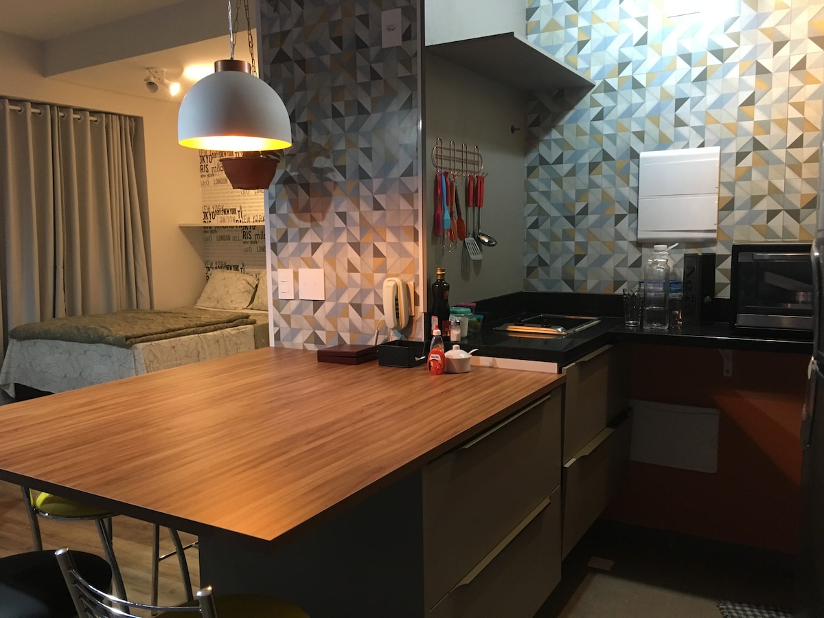 Isang silid - tulugan na apartment (46,30m2 na lugar) na matatagpuan sa isang mahusay na sentro ng paglilibang na may mahusay na serbisyo at mga kamangha - manghang pasilidad sa wellness (mga pool, spa, gym at iba pa). Kahanga - hangang lokasyon, malapit lang sa karagatan. Available ang wifi sa flat at sa mga lugar ng pagtanggap at paglilibang. Sa tabi ng supermarket ng Pão de Açúcar, binuksan araw - araw mula 7am -11pm (coffee shop at quick meal restaurant sa loob).